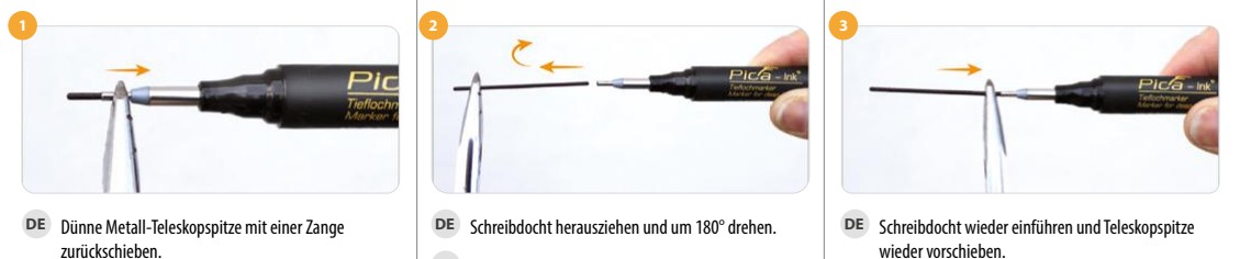 - 3-fache Markierleistung durch die bewegliche und selbst nachstellende Teleskopspitze: volle Nutzung von 7 mm Abrieb des Schreibdochts, anstatt 2 mm