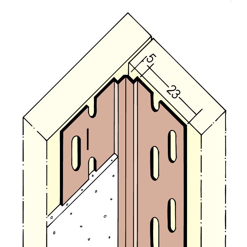 Inneneckprofil aus PVC. Durch "Knickfalte" universell einsetzbar für Winkel von 70° bis 135°. Das Profil ist zusätzlich mit Klammern zu befestigen um eine Rückstellung zu vermeiden. PVC-Mittelteil kann nur bedingt mit geeigneten Beschichtungen überarbeitet werden. Die Freigabe durch den Beschichtungshersteller ist erforderlich.