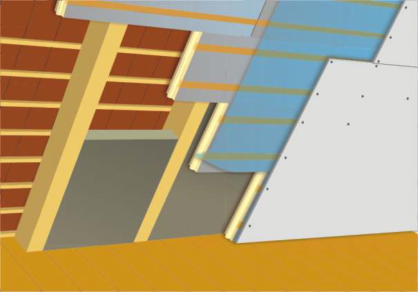 Für die direkte Befestigung der Dämmung und der raumseitigen Verkleidung (z. B. mit Gipskartonplatten) sind zusätzlich 2 Mehrschichtholzleisten in die Dämmplatten eingelassen.