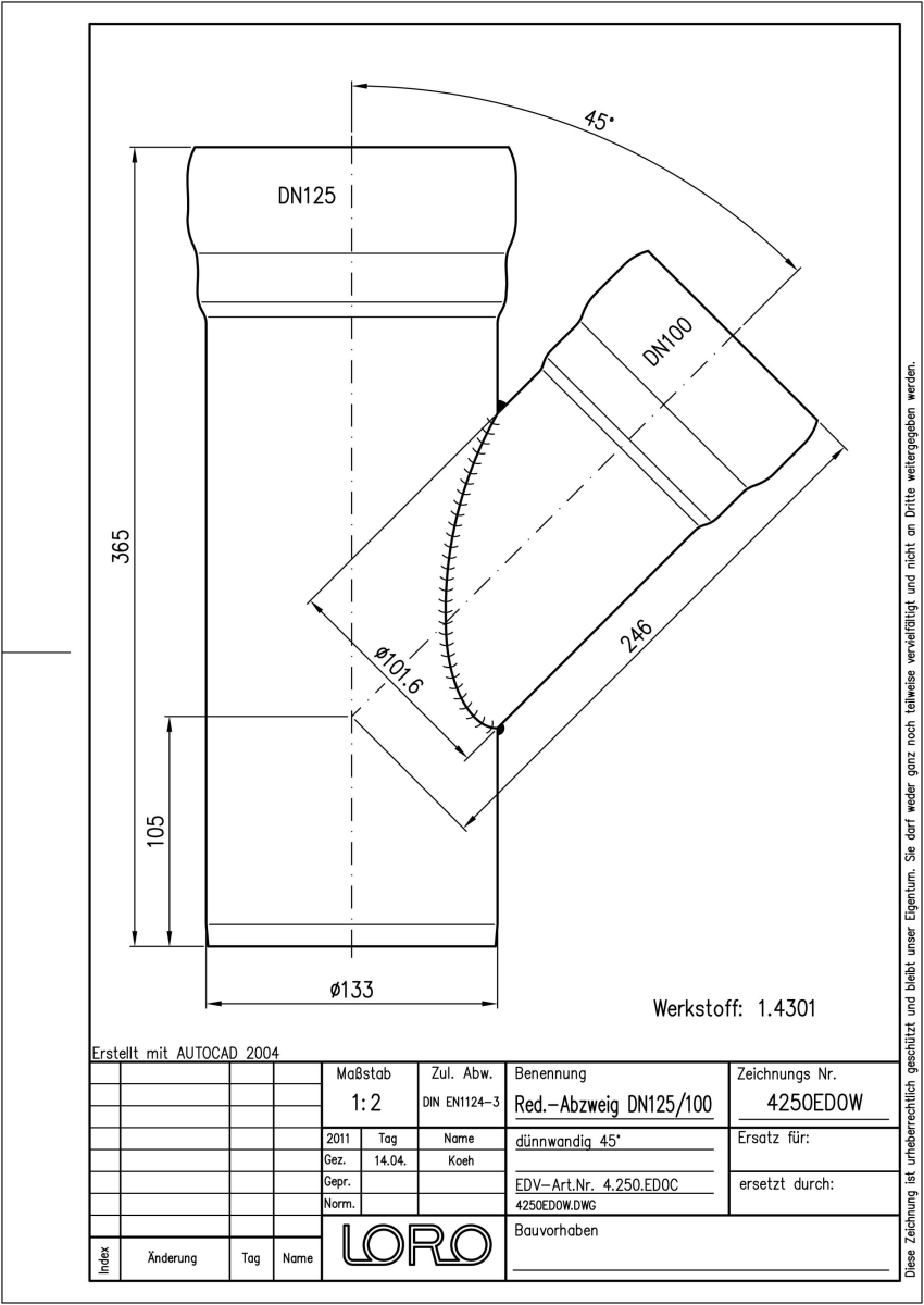LORO-XCL Red.-Abzweig, aus Edelstahl, Werkstoff Nr. 1.4301, gebeizt und passiviert, nach DIN EN 1124 mit erhöhtem Qualitätsstandard gemäß RAL-Gütezeichen GZ-694, mit 2-Kammern-Steckmuffenverbindung, Baustoffklasse A1, formstabil, bruchfest, rückstausicher, 45 Grad, DN 125/100