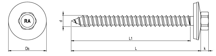 Gewindefurchende Schraube zur Befestigung von Aluminium-, Stahlprofilblechen, Faserzementtafeln und Sandwichelementen auf Holz- und Stahlunterkonstruktionen. Empfohlene Einschraubtiefe bei Blech auf Holz min. 26 mm, bei Sandwichelementen auf Holz 45 mm.