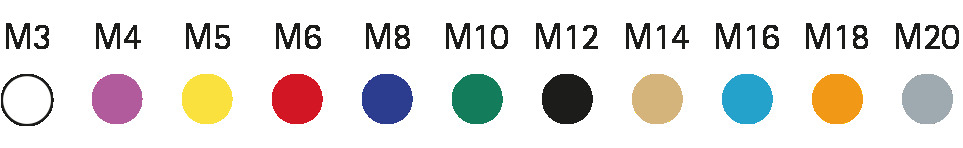 Gewindestangen nach Durchmesser farbig markiert. Stahl-Gewindestangen gebündelt: M3 - M5 je 20 Stk., M6 - M12 je 10 Stk., M14 - M20 je 5 Stk.