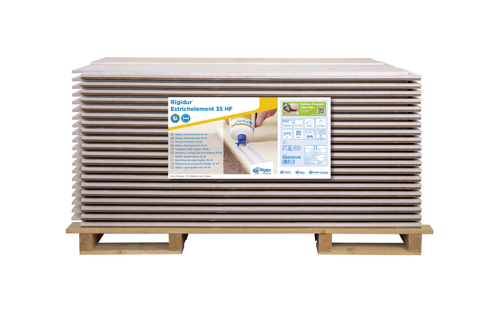Das Rigidur Estrichelement 35 HF von Rigips besteht aus vorgrundierten Gipsfaserelementen mit Stufenfalz und unterseitiger Holzweichfaser-Kaschierung. Es verfügt über eine extrem harte und glatte Oberfläche und dient zur schnellen Herstellung von Trockenestrichböden mit Brand- und Schallschutzanforderungen in Neubauten und bei Altbausanierungen. Für unterschiedlichste Oberbeläge geeignet.