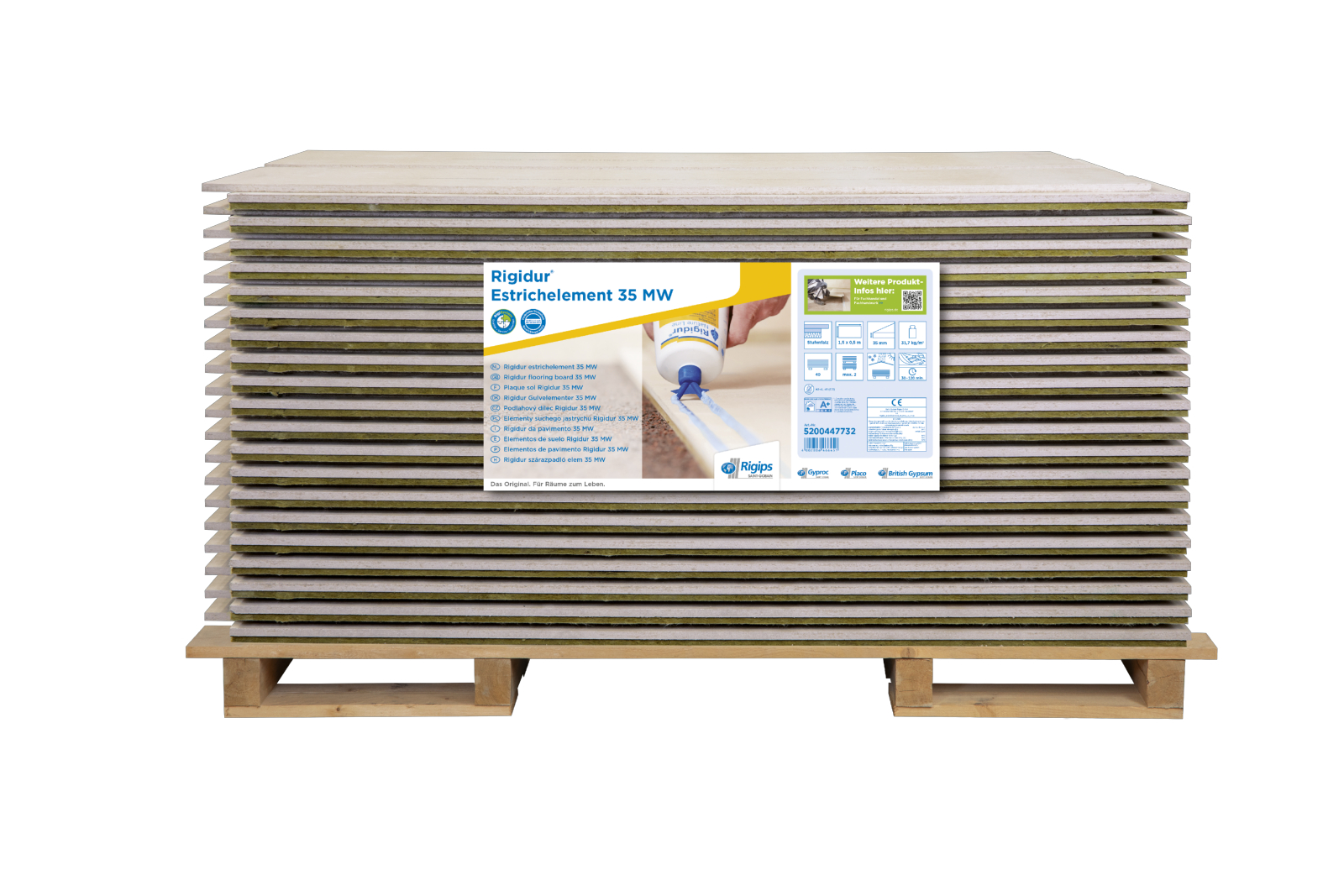 Das Rigidur Estrichelement 35 MW von Rigips besteht aus vorgrundierten Gipsfaserelementen mit Stufenfalz und unterseitiger Mineralwolle-Kaschierung. Es verfügt über eine extrem harte und glatte Oberfläche und dient zur schnellen Herstellung von Trockenestrichböden mit speziellen Anforderungen an den Trittschall-, Wärme- und Brandschutz in Neubauten und bei Altbausanierungen.