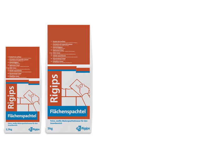 Der Rigips Flächenspachtel ist ein Gips-Putztrockenmörtel gemäß DIN EN 13279-1: B1/20/2. Er dient zur Erstellung glatter Flächen sowie zum Füllen und Spachteln von Rissen und Löchern. Die feine, weiße Spachtelmasse ist im 2,5-kg-Beutel und im 5-kg-Beutel erhältlich.