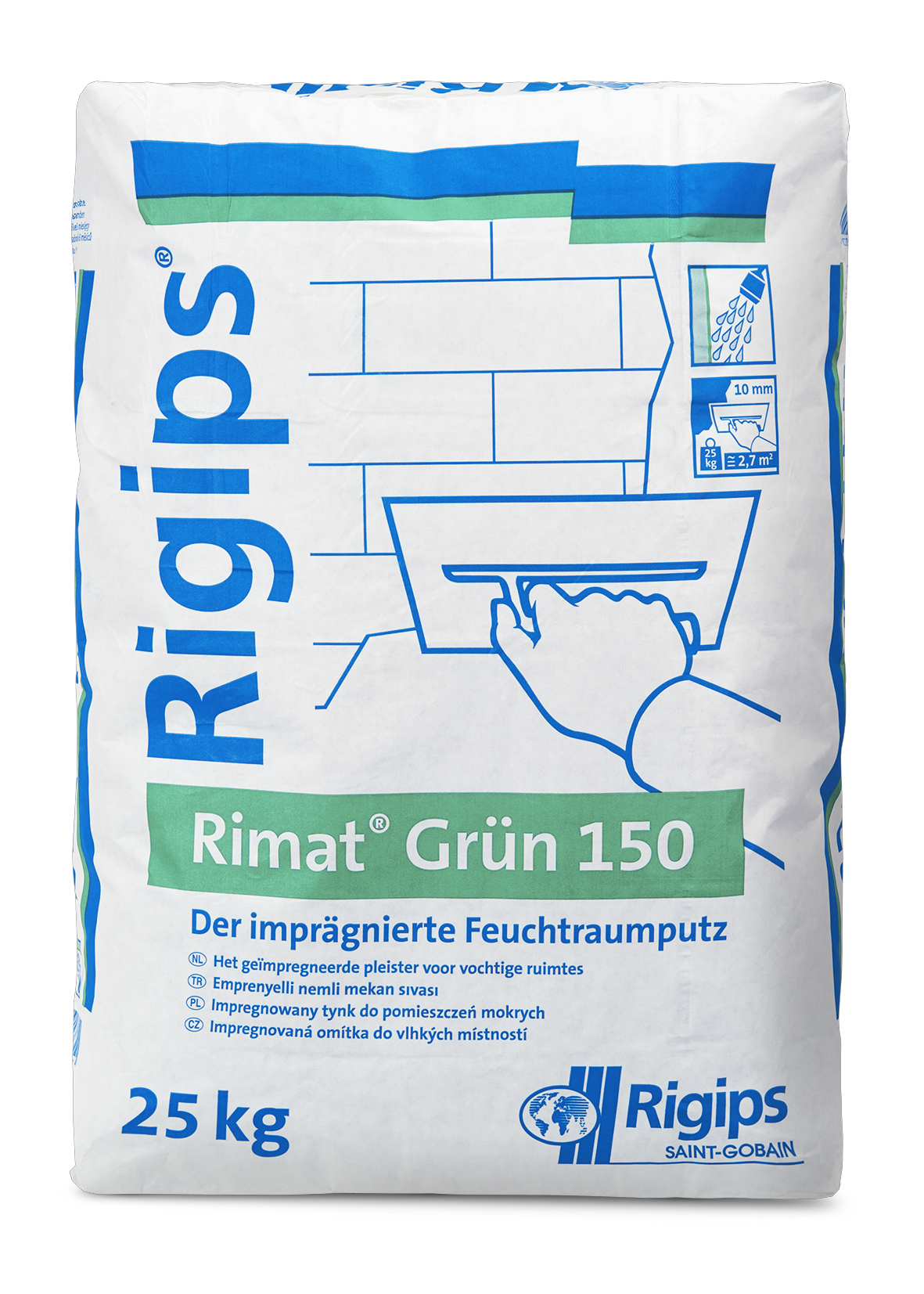 Der Rimat Grün 150 von Rigips ist ein imprägnierter Gipsleicht-Putztrockenmörtel gemäß DIN EN 13279-1. Der schnell und einfach zu verarbeitende Handputz dient zum Verputzen von Mauerwerk aller Art, schalungsraum Beton, Porenbeton und Putzträgern in Bereichen von geringer bis mäßiger Feuchtebeanspruchung wie häuslichen Küchen oder Badezimmern. Erhältlich im 10-kg-Sack und im 25-kg-Sack.