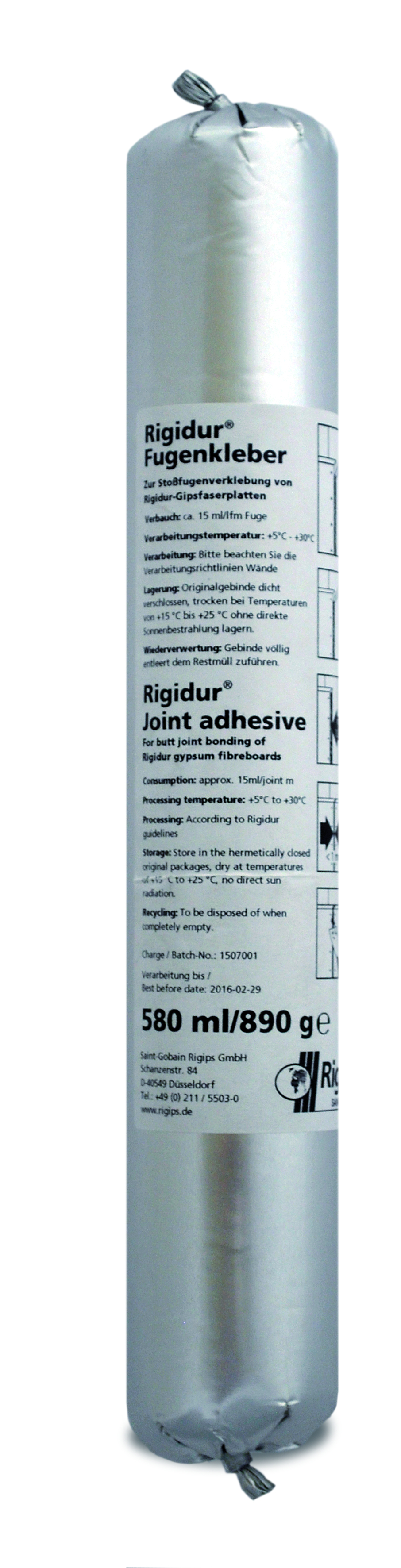 Der Rigidur Fugenkleber (Schlauchbeutel) von Rigips ist ein pastöser, einkomponentiger, lösungsmittelfreier Fugenkleber auf Polyurethan-Basis und dient zur Verklebung von Rigidur Gipsfaserplatten in Klebefugentechnik. Die Ausführung der Klebefugentechnik erfolgt mit einem max. Fugenspalt von 1 mm, wobei der Kleber satt auf der Stirnkante der Platte aufzutragen ist.