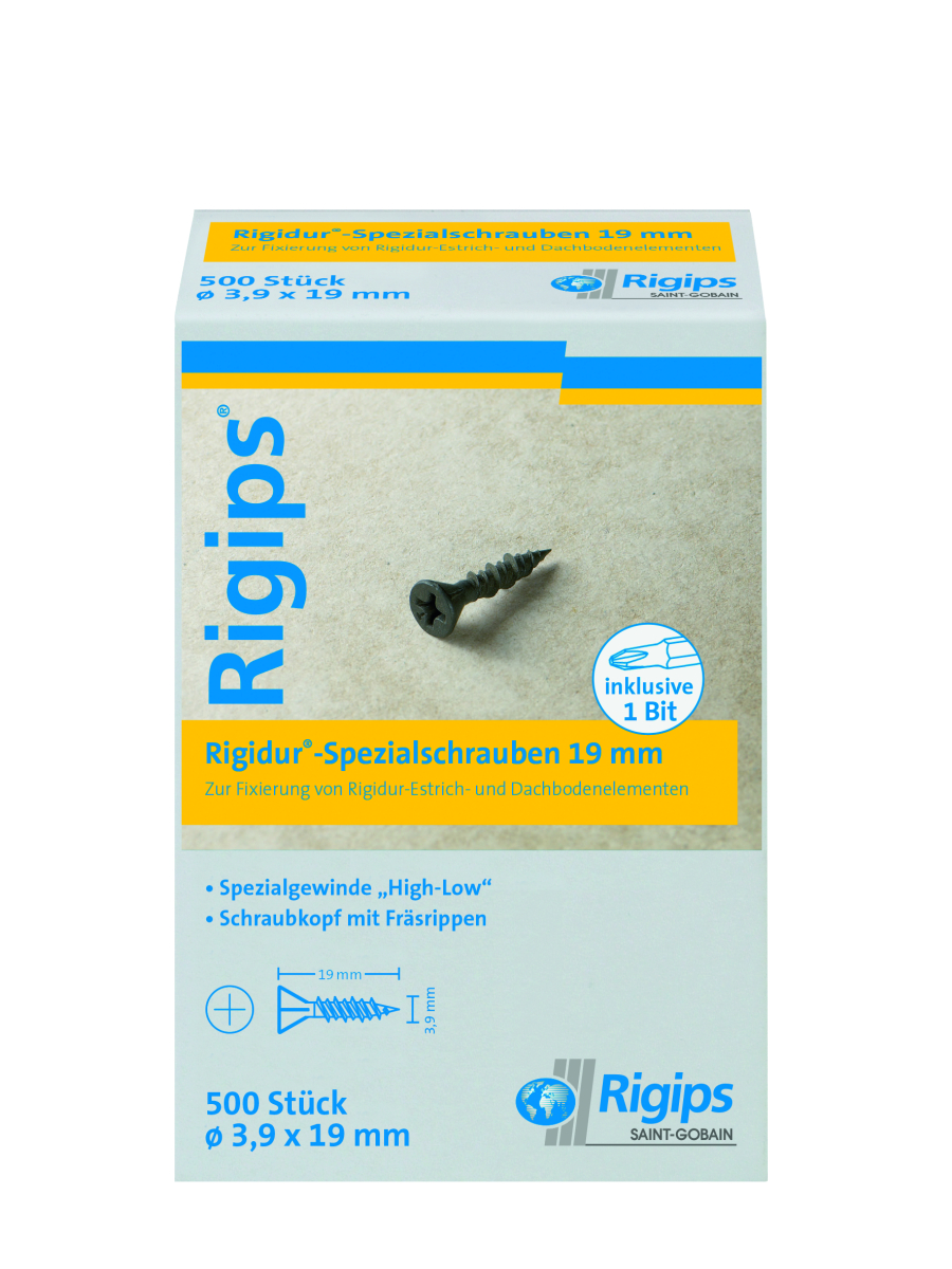 Die Rigidur Schnellbauschraube von Rigips (Typ UMN nach EN 14566) aus spezialbehandeltem Stahl (schwarz phosphatiert) verfügt über eine spezielle Kopfform mit Fräsrippen, ein HiLo-Doppelganggewinde, eine Nadelspitze sowie einen Kreuzschlitz PH Gr. 2. Die Schnellbauschraube dient zur Verschraubung von Rigidur Estrichelementen: 3,9 x 19 mm für Estrichaufbau 2 x 10 mm, 3,9 x 22 mm für 2 x 12,5 mm.