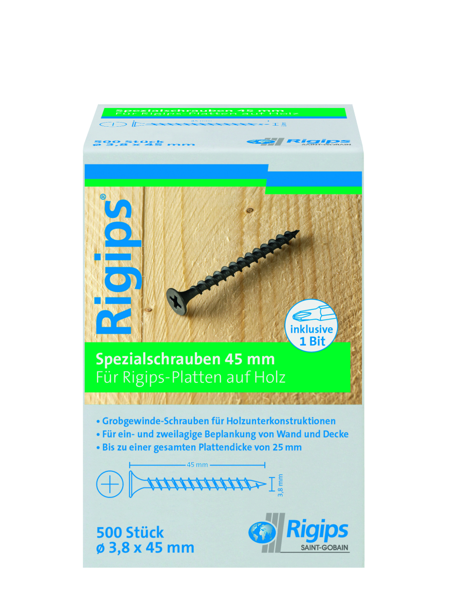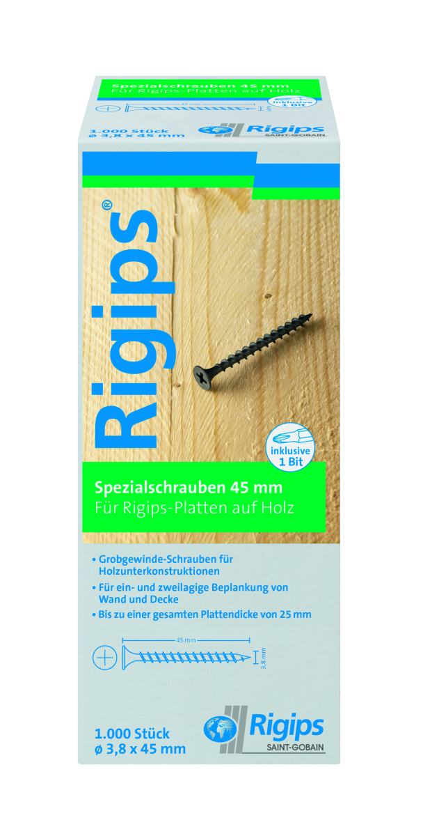 Die Rigips Schnellbauschraube TN (Grobgewinde), Typ THN nach EN 14566, aus spezialbehandeltem Stahl (schwarz phosphatiert, nach DIN 18182-2) verfügt über einen Trompetenkopf, eine ausgewalzte Spitze, einen Kreuzschlitz PH Gr. 2 und ein Grobgewinde. Sie dient zur Befestigung von Gipsplatten auf Holzunterkonstruktionen sowie zur flächigen Befestigung (inkl. Stirnkanten) von Rigips Glasroc F Platten.