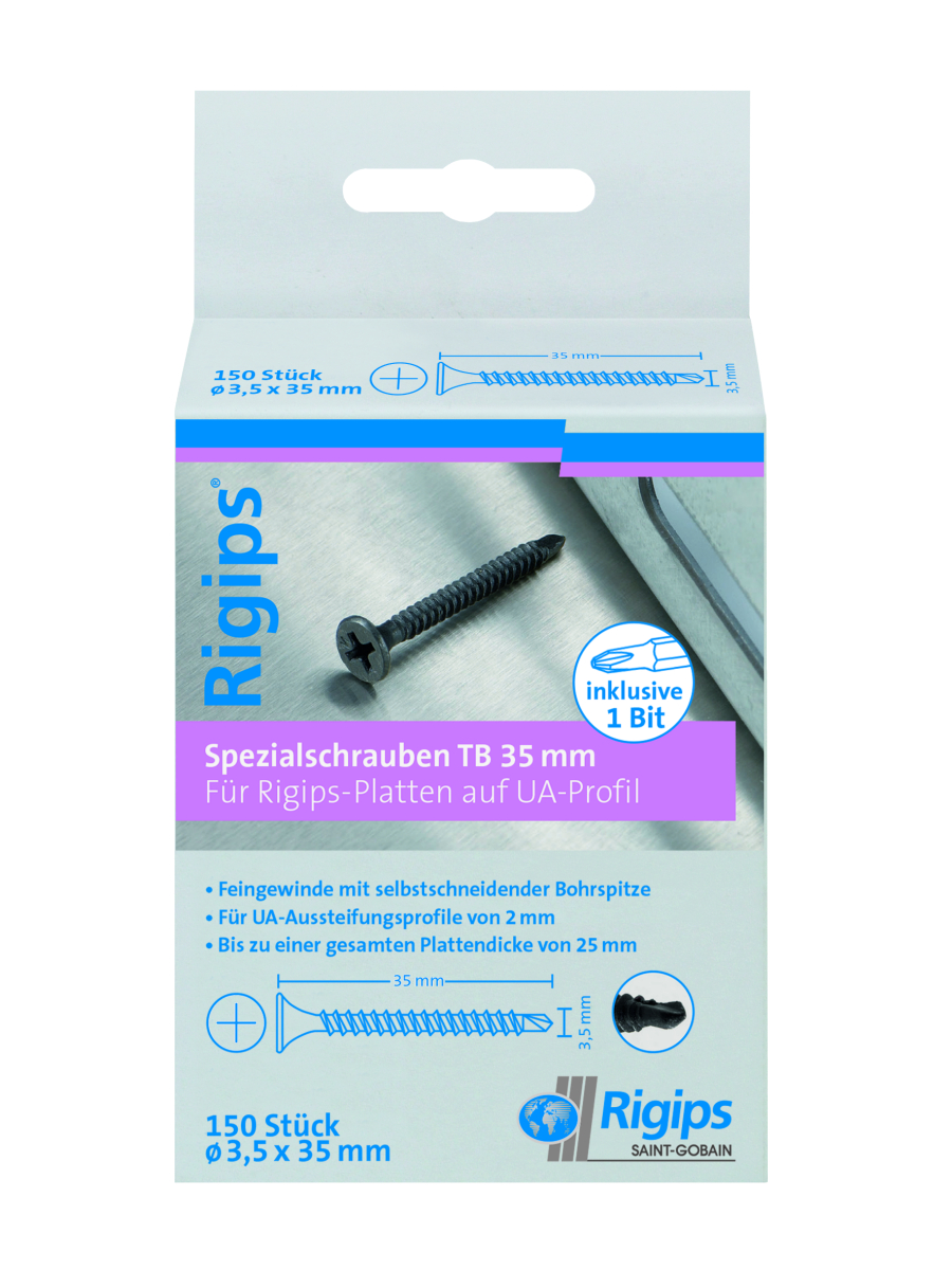 Die Rigips Schnellbauschraube TB (Typ TMD nach EN 14566) aus spezialbehandeltem Stahl (schwarz phosphatiert, nach DIN 18182-2) verfĂĽgt ĂĽber einen Trompetenkopf, eine Bohrspitze sowie einen Kreuzschlitz PH Gr. 2. Die Schnellbauschraube TB dient zur Befestigung von Gipsplatten auf Metallprofilen aus Stahlblech von 0,7 bis 2,25 mm Dicke.