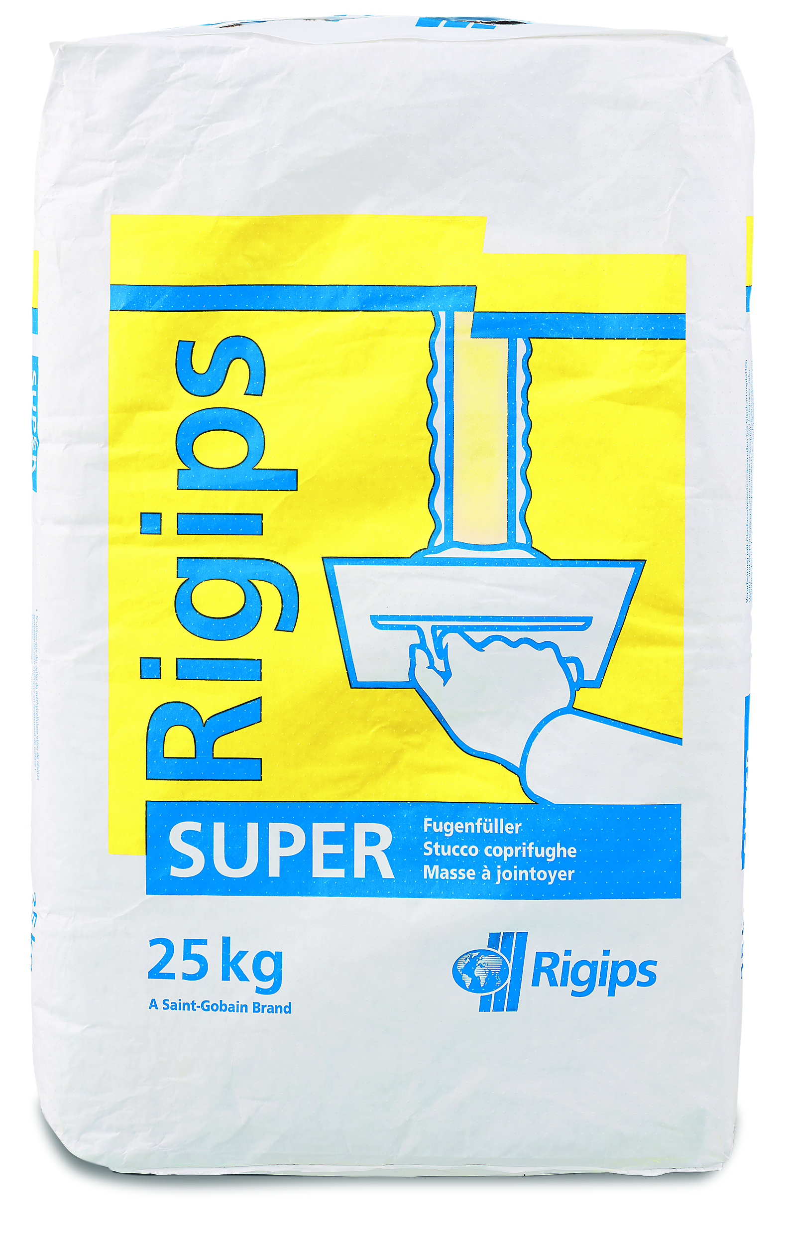 Der SUPER Fugenfüller von Rigips ist ein gipsgebundener und kunststoffvergüteter Füll- und Feinspachtel gemäß DIN EN 13963/Typ 3B. Er dient mit dem Rigips Glasfaserbewehrungsstreifen zur Verspachtelung der Fugen und Anschlüsse von Rigips Platten. Die Verarbeitungszeit beträgt ca. 45 Minuten. Verbrauch: Fuge = ca. 300 g/m2.
