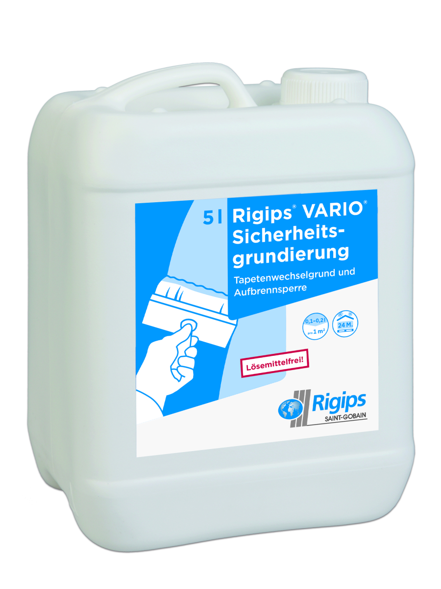 Die Rigips VARIO Sicherheitsgrundierung ist eine Spezialgrundierung ohne Lösungsmittel mit Tiefenwirkung zur Untergrundbehandlung vor Anstrich-, Tapezier- und Fliesenarbeiten. Sie eignet sich zum Grundieren von Rigips Platten, Gipsputzen, Vollgipsplatten, Kalksandstein- und Ziegelmauerwerk sowie Beton und Porenbeton je nach Anforderung. Eingefärbt und streichfertig, Verbrauch ca. 0,1 - 0,2 l/m².