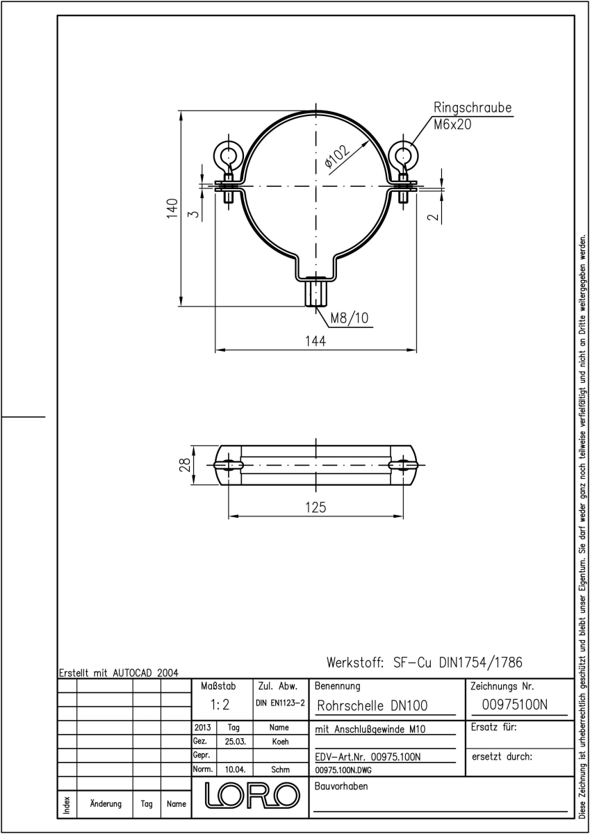 LORO-N Rohrschelle mit Kombi Gewinde M 8/10, aus Kupfer, ohne Schalldämmung, DN 100