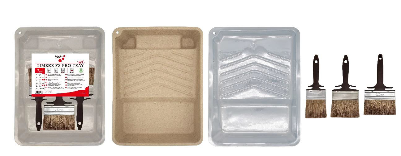 Holzschutzstreicher-Set 7-teilig bestehend aus 3 Pinsel, einer nicht flüssigkeitsfesten Papierfarbwanne und 3 Kunststoffeinleger aus PET.