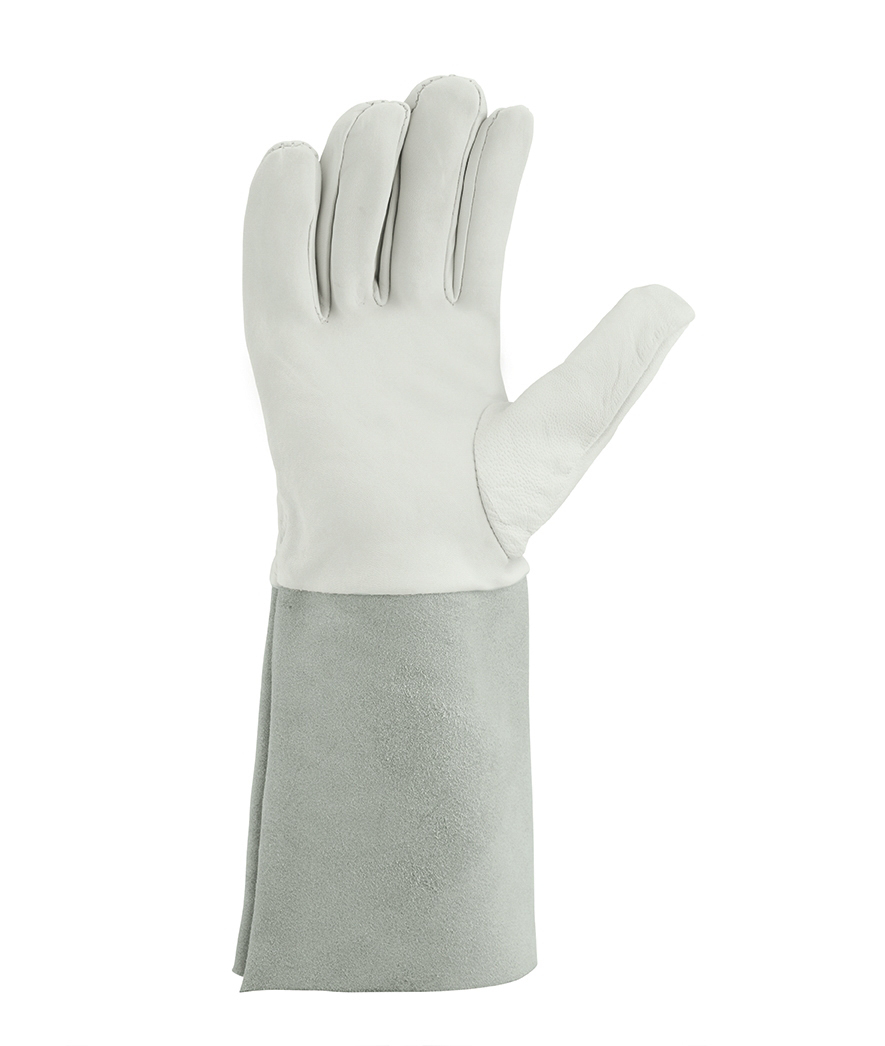 Ziegen-/Schafsnappaleder, unbeschichtet, 5-Finger-Design, ungefüttert, Pulsschutz durch extra lange Stulpe, eingesetzter Daumen, Materialstärke: 0,7-0,8 mm, Handschuhlänge: ca. 35 cm (Größe 10)