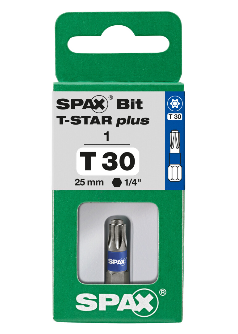 Passend zu unserem SPAX Sortiment mit T-STAR plus Kraftangriff bieten wir exakt auf unsere Schrauben abgestimmte SPAX Bits in T-STAR plus-Ausführung, gut erkennbar an der orangenen Farbcodierung.