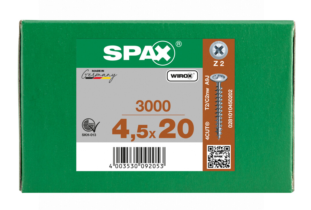 - 4CUT: Ohne Vorbohren (holzabhängig), ihre Spitze verringert wirkungsvoll die Spaltwirkung. Vierkant verdrängt die Fasern des Holzes und reduziert das Einschraubdrehmoment.