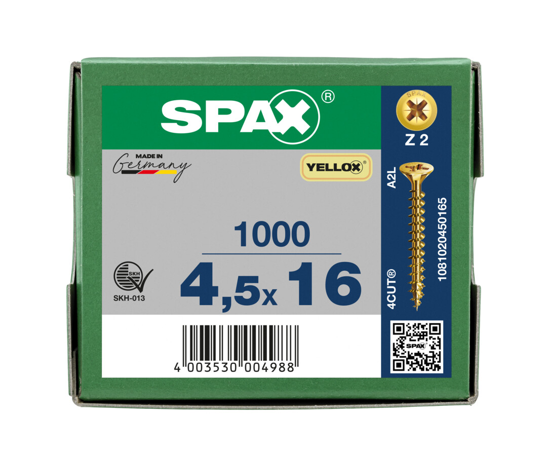 - 4CUT: Ohne Vorbohren (holzabhängig), ihre Spitze verringert wirkungsvoll die Spaltwirkung. Vierkant verdrängt die Fasern des Holzes und reduziert das Einschraubdrehmoment.