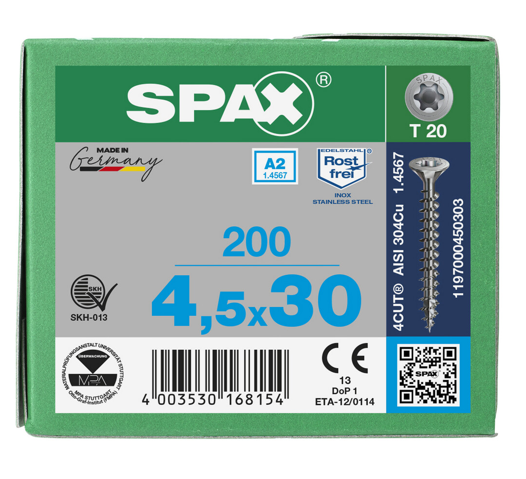 - 4CUT: Ohne Vorbohren (holzabhängig), ihre Spitze verringert wirkungsvoll die Spaltwirkung. Vierkant verdrängt die Fasern des Holzes und reduziert das Einschraubdrehmoment.