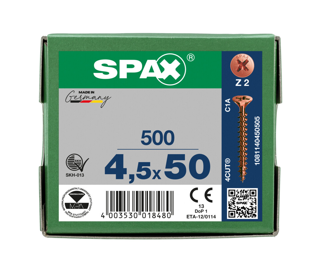 - 4CUT: Ohne Vorbohren (holzabhängig), ihre Spitze verringert wirkungsvoll die Spaltwirkung. Vierkant verdrängt die Fasern des Holzes und reduziert das Einschraubdrehmoment.