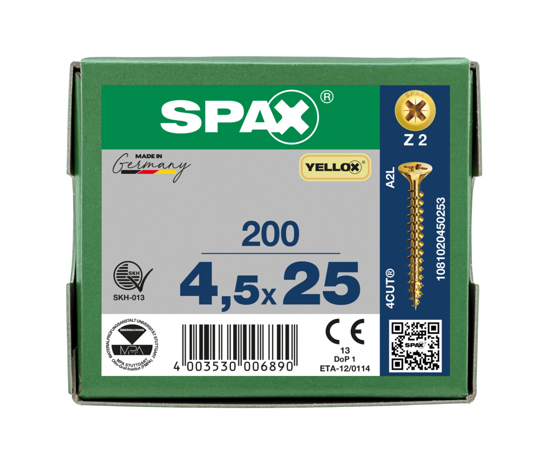 - 4CUT: Ohne Vorbohren (holzabhängig), ihre Spitze verringert wirkungsvoll die Spaltwirkung. Vierkant verdrängt die Fasern des Holzes und reduziert das Einschraubdrehmoment.
