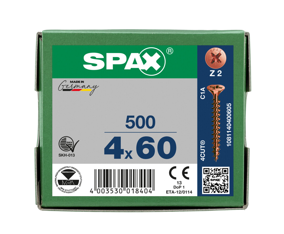 - 4CUT: Ohne Vorbohren (holzabhängig), ihre Spitze verringert wirkungsvoll die Spaltwirkung. Vierkant verdrängt die Fasern des Holzes und reduziert das Einschraubdrehmoment.