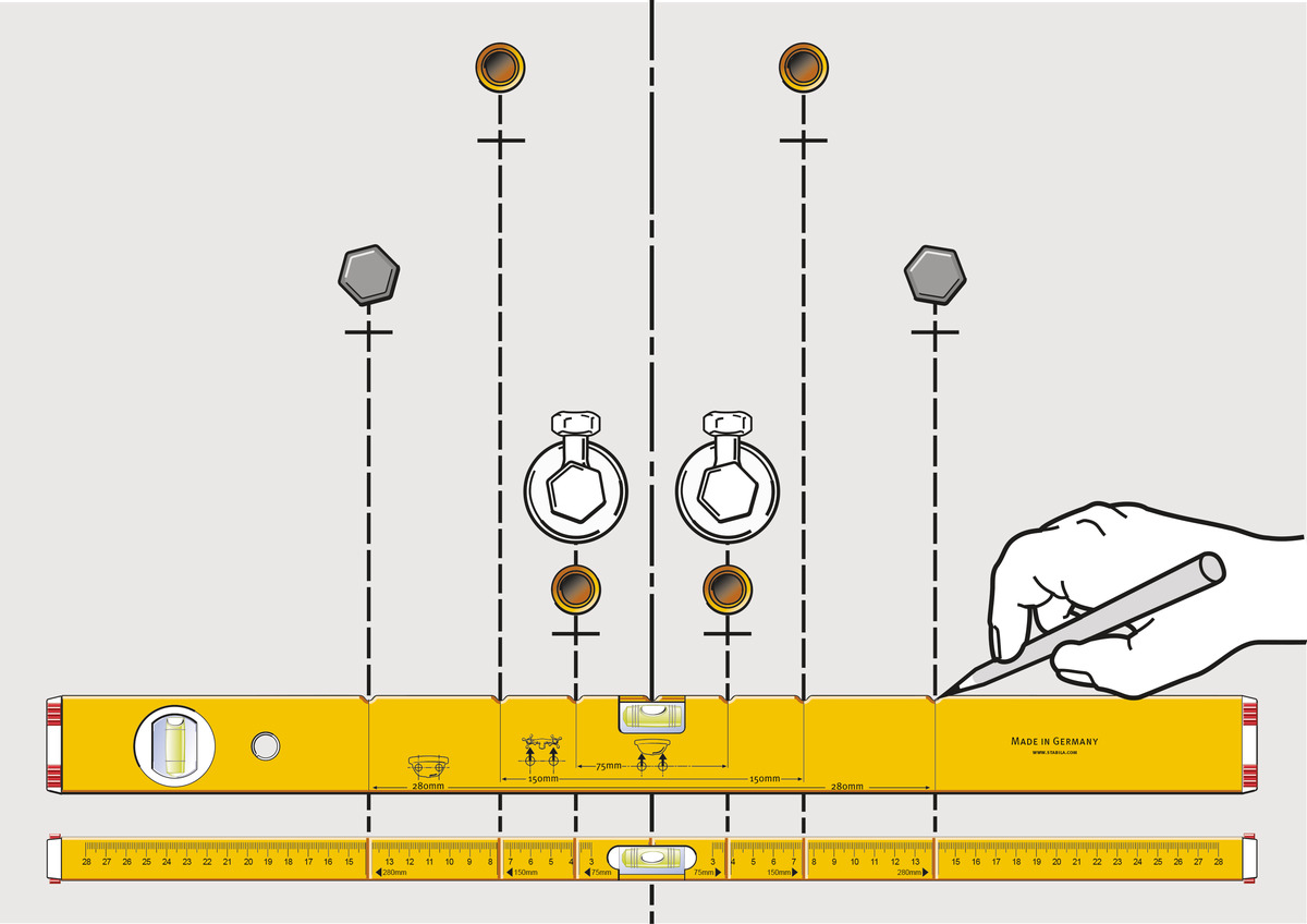Besonders geeignet bei Installationsarbeiten im Heizungs- und Sanitärbereich, zum Beispiel Übertragen der Bohrlochmarkierungen für Waschbeckenhalter und Ventile.