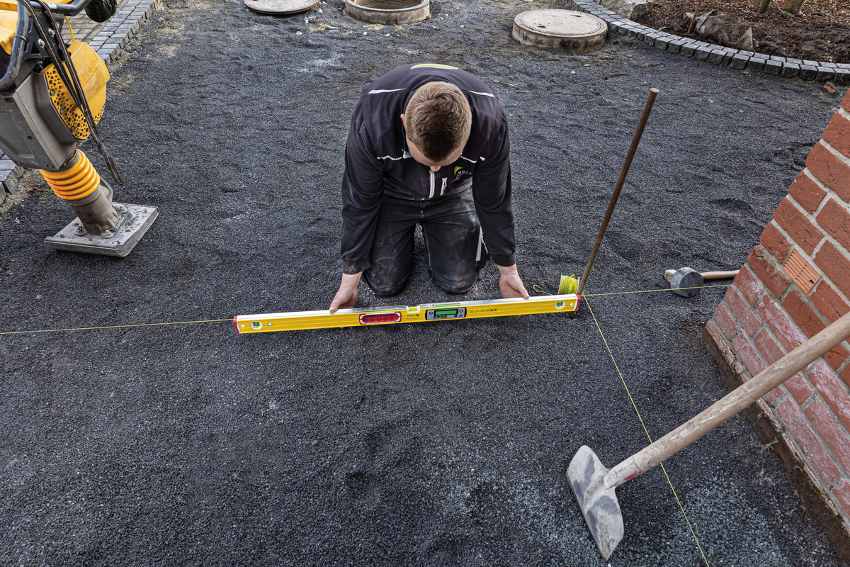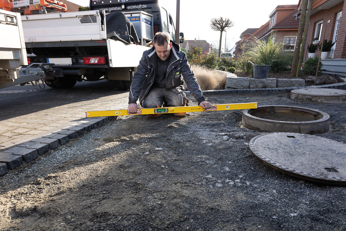 - Optimaler Helfer im Garten- und Landschaftsbau beim Anlegen eines Gartenwegs mit Gefälle.