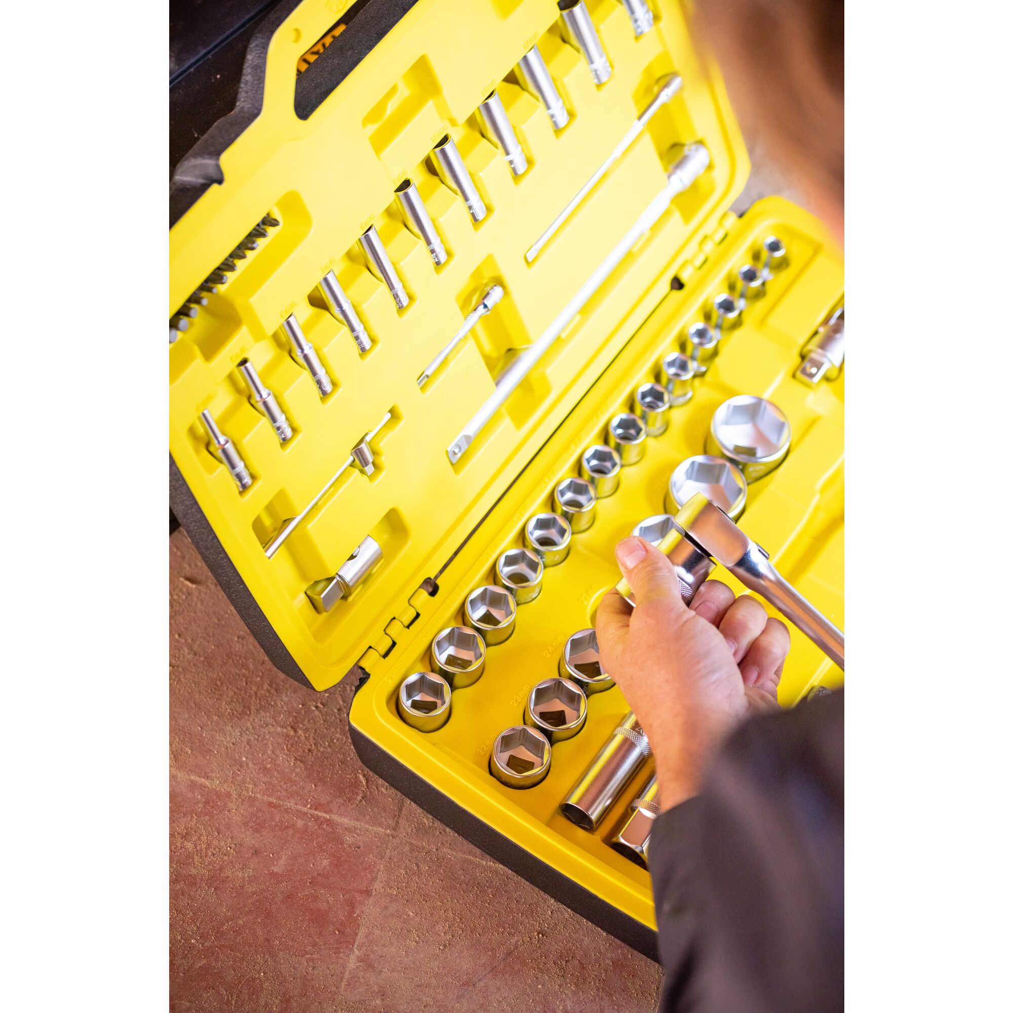 Inhalt: 1x ½“ 120T Umschaltknarre mit Bi-Material-Griff, 21x ½“ Steckschlüssel (6-Kant) : 8 bis 34mm, 2x ½“ Verlängerungen: 3” - 5”, 1x ½“ T-Gleit-Adapter, 1x ½“ Kardangelenk