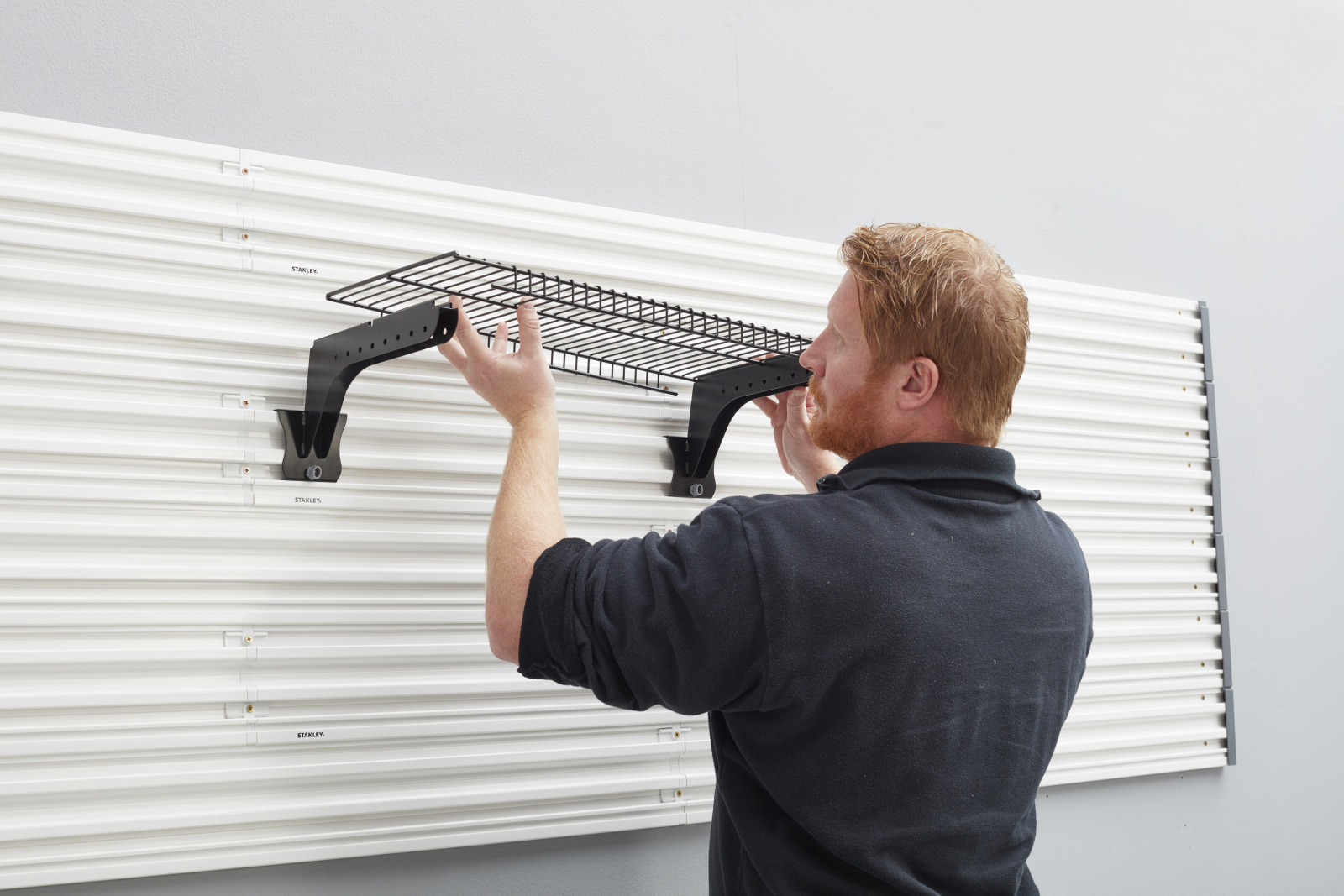 Regalplatte ist oberhalb der Schiene angebracht, sodass darunter zusätzliches Trackwalls Hakenzubehör angebracht werden kann.