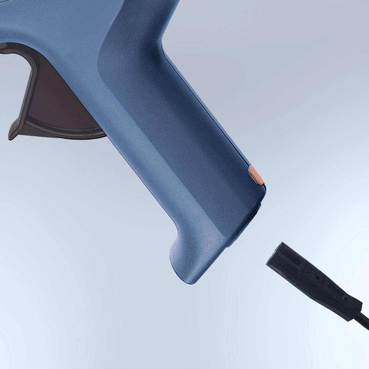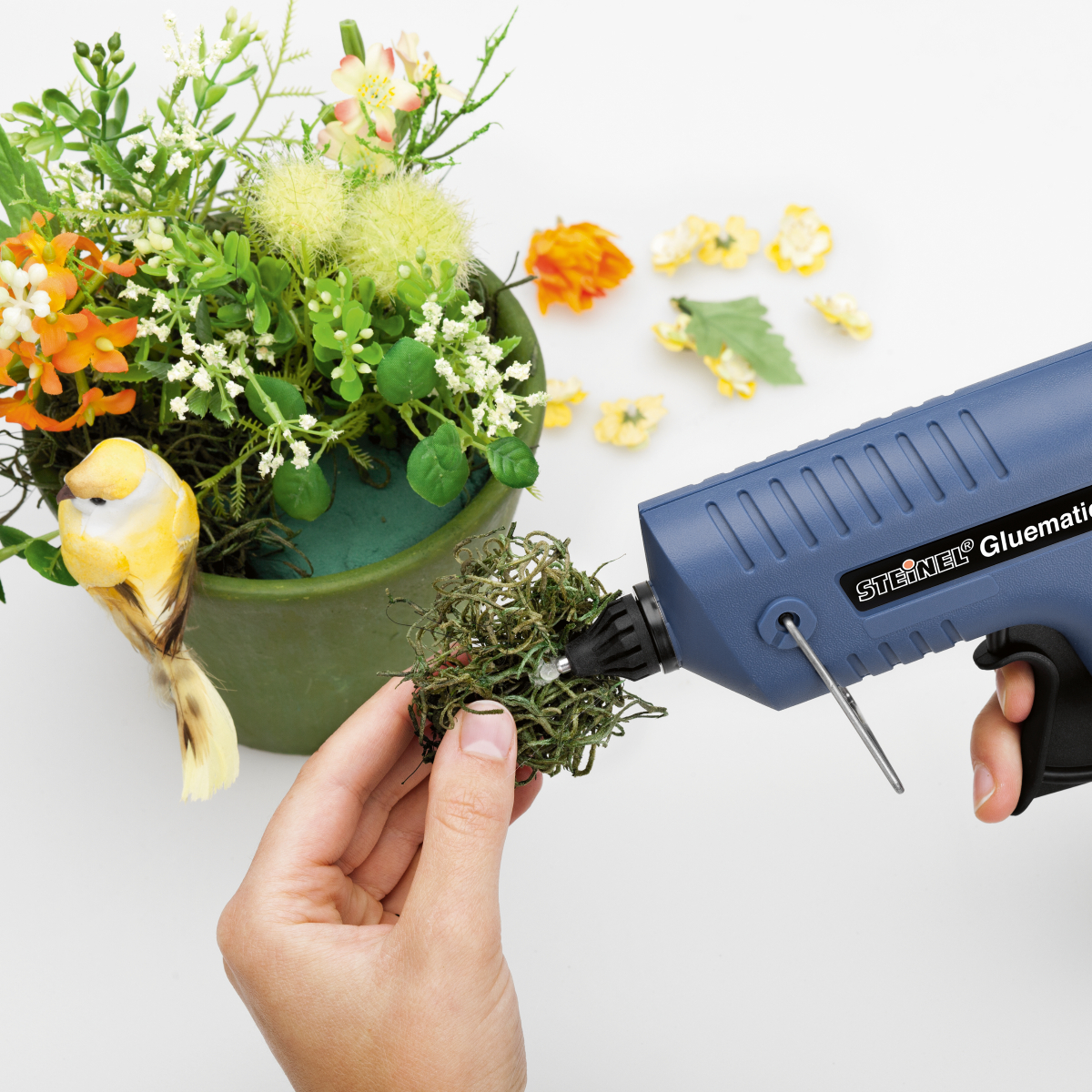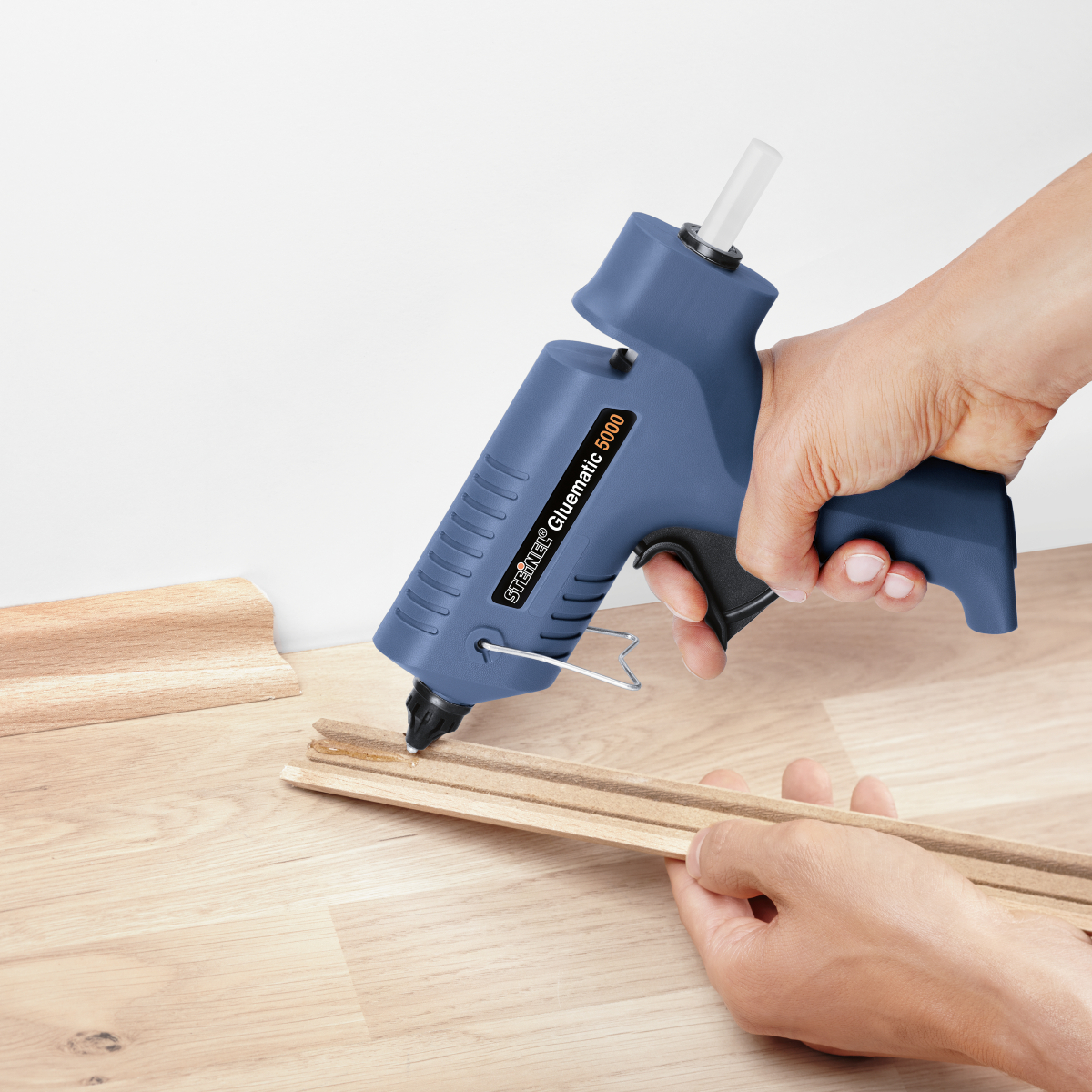 Stark. Sauber. Flexibel. Ohne Kompromisse. Holzdübel fixieren, Bilderrahmen kleben oder Blumengestecke befestigen: Für die leistungsstarke Gluematic 5000 kein Problem – und zwar überall und jederzeit. Denn nach nur drei bis fünf Minuten Aufwärmzeit ist das Werkzeug dank moderner Wärmespeicherung für 20 Minuten kabelloses Arbeiten bestens geeignet. Für großflächige und längere Klebearbeiten lässt sich der Allrounder mit sehr hoher Schmelzleistung (22 g/min) natürlich auch direkt an die Stromversorgung anschließen.