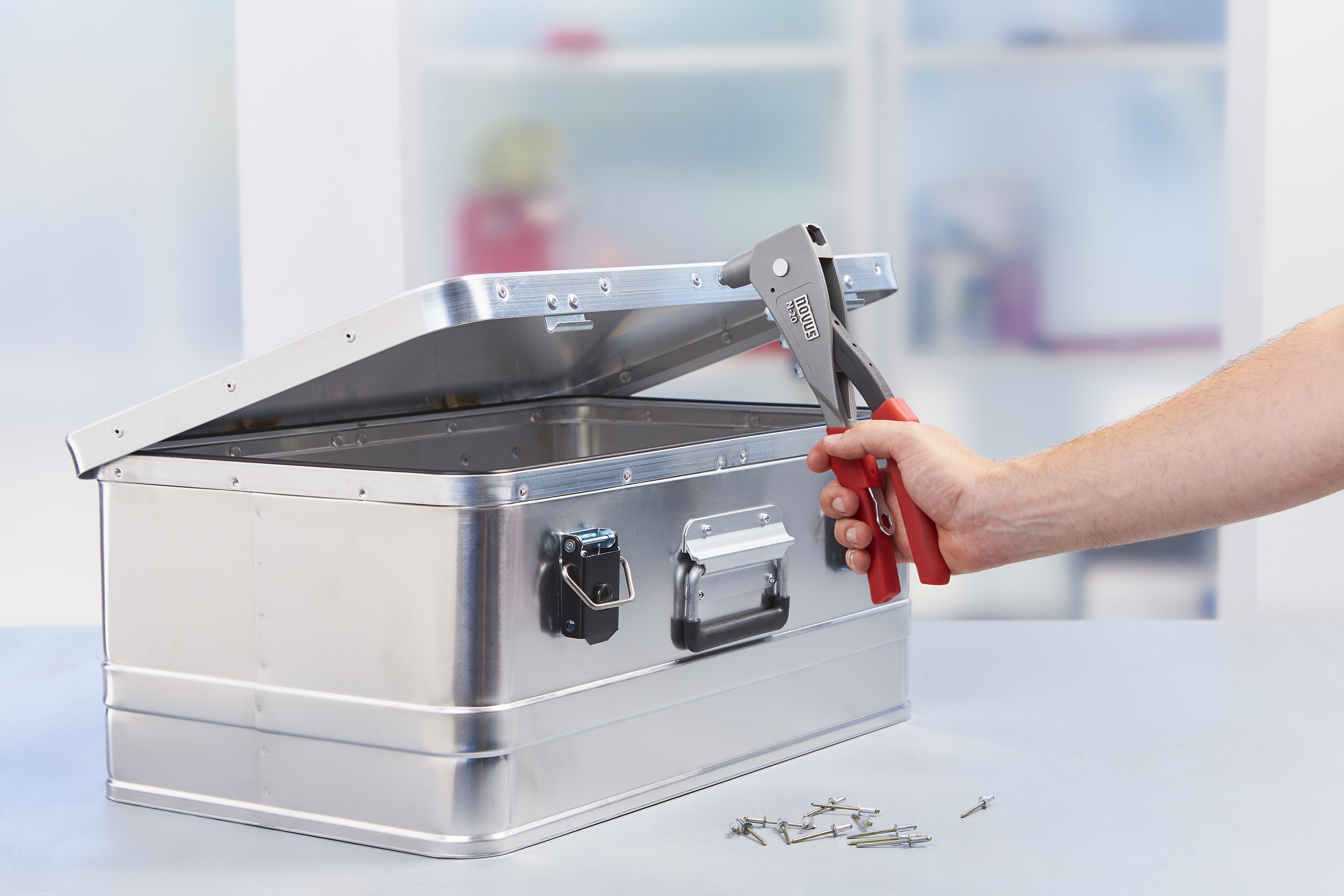 Blindnietzange. Die Standard-Blindnietzange für universelles Arbeiten beim Heimwerken. Gerätekörper aus Aluminium und Hebel stahlgeschmiedet. Ausgestattet mit drei Mundstücken und Gewindedornen, Montageschlüssel, Einstellschraube zur Hubbegrenzung und Griffsicherung.