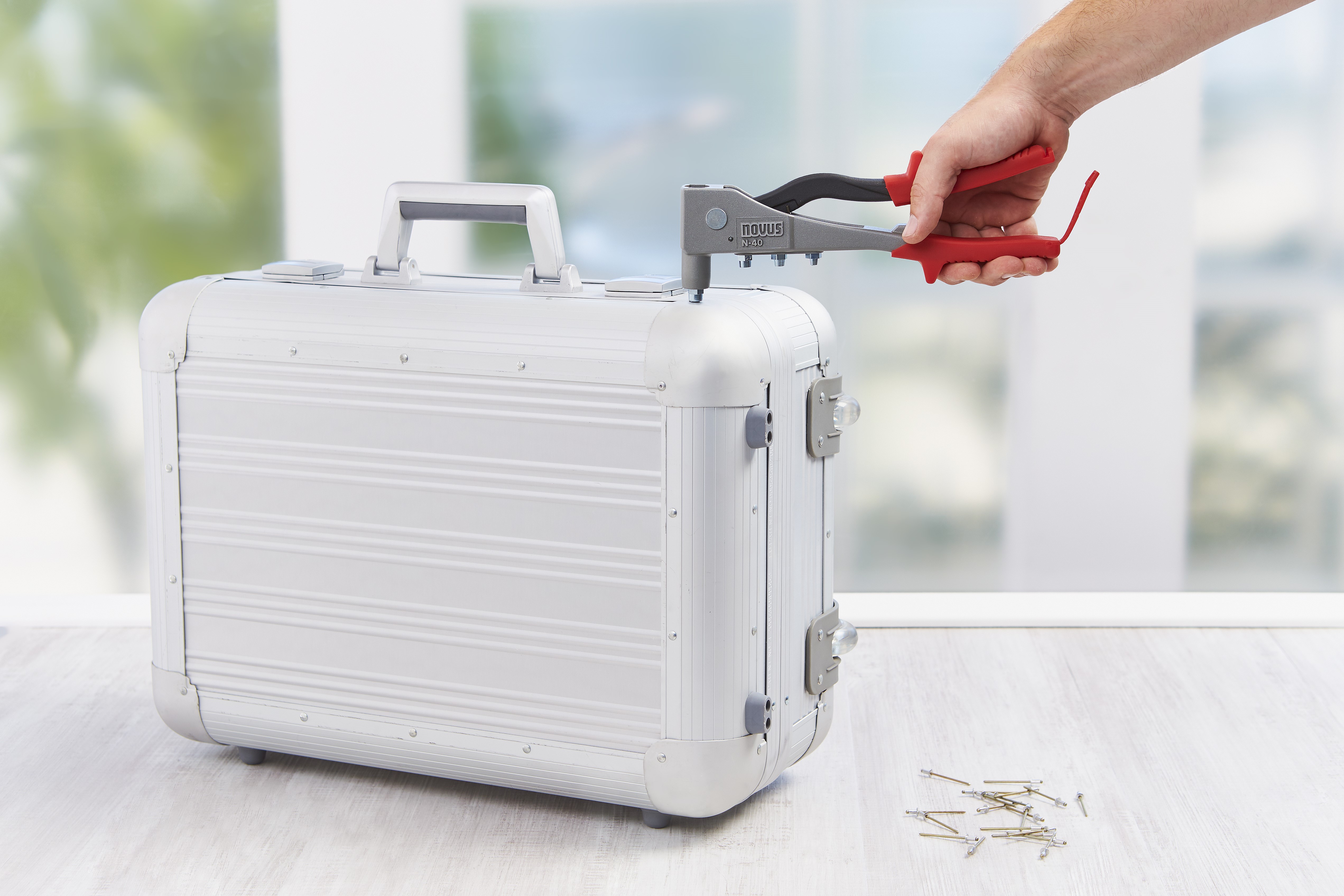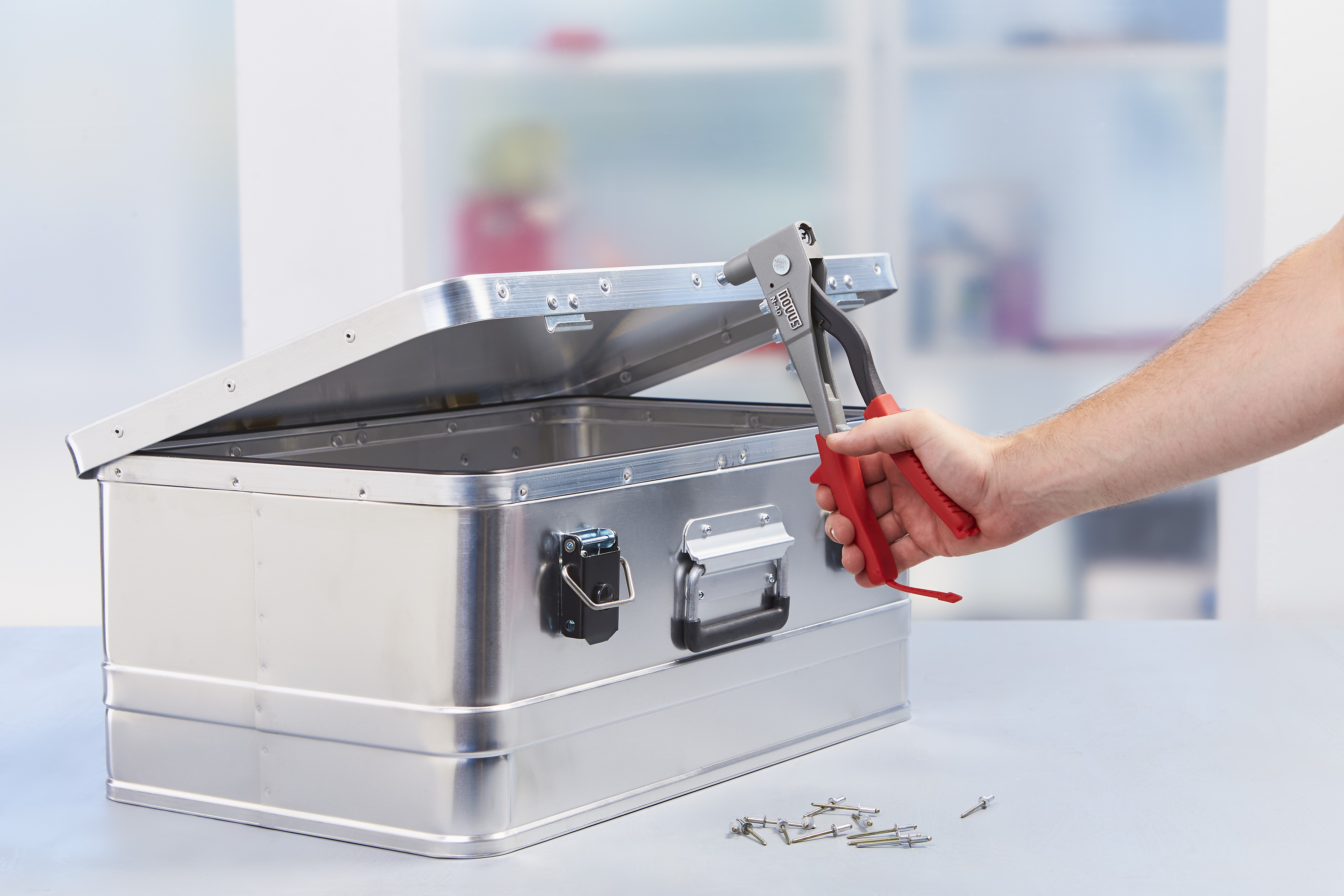 Blindnietzange. Die robuste und universelle Blindnietzange für Arbeiten beim Heimwerken und in der Werkstatt. Gerätekörper aus Aluminium und Hebel stahlgeschmiedet. Ausgestattet mit vier Mundstücken inklusive Montageschlüssel, Griffsicherung und Rückholfeder für 1-Hand-Bedienung. Verarbeitet Aluminium Blindniete A2,4, A3, A4, A5, Stahl Blindniete S3 und S4 und Kupfer Blindniete C4.