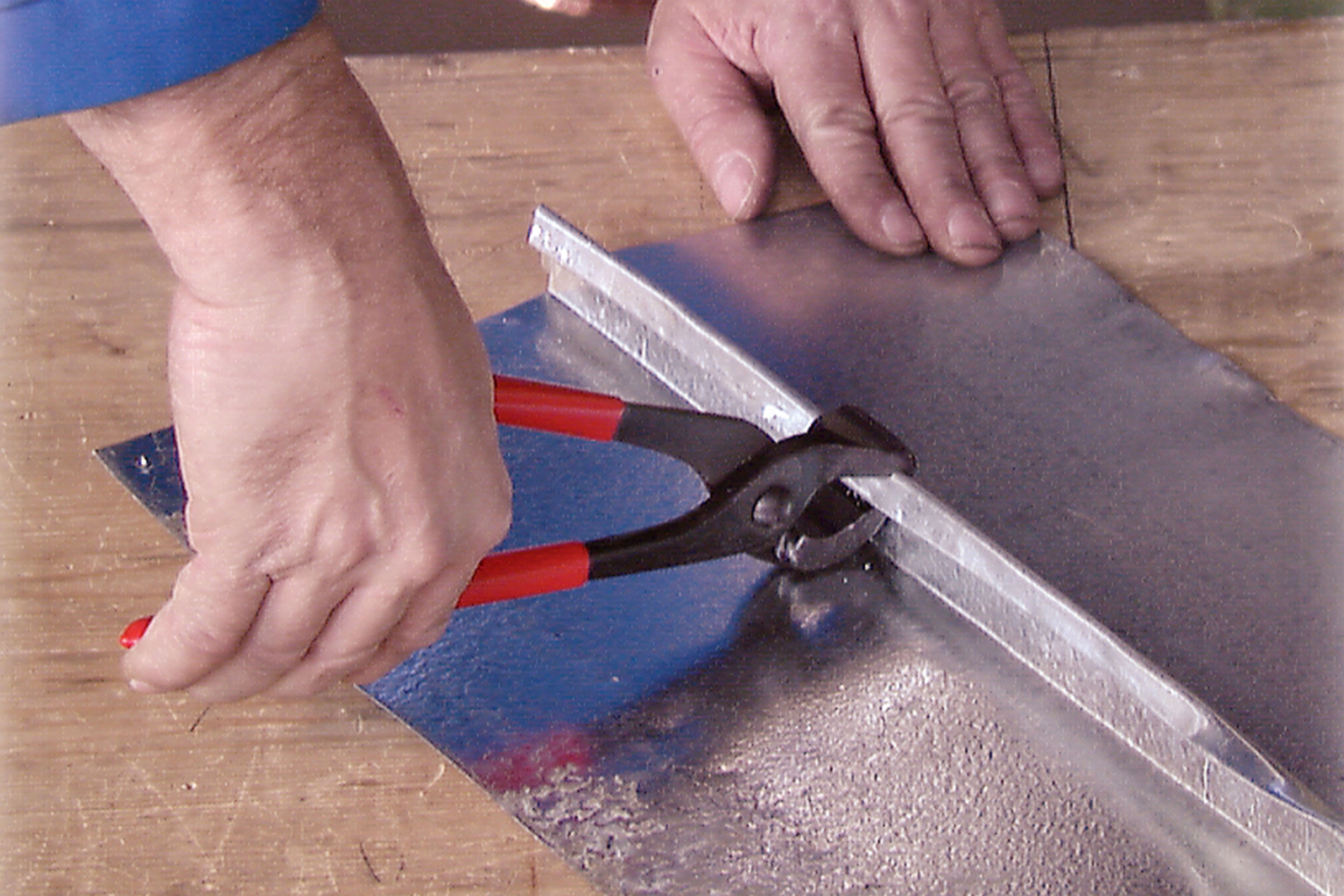 Spezialzange, geschmiedet, Schenkel rot kunststoffbeschichtet, zum schnellen Öffnen von Steh- und Doppelfälzen, Oberbacke mit Schneide, Unterbacke mit Prisma.