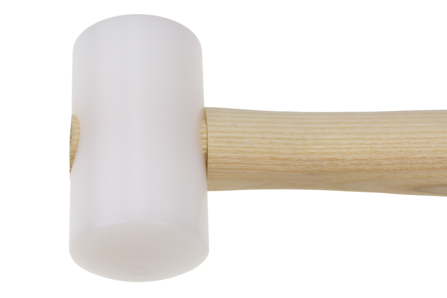 Runder Hammerkopf, aus verschleißfestem Kunststoff, hochschlagfest (splitterfrei), Kanten abgerundet, zusätzliche Verschraubung zur Stielbefestigung.