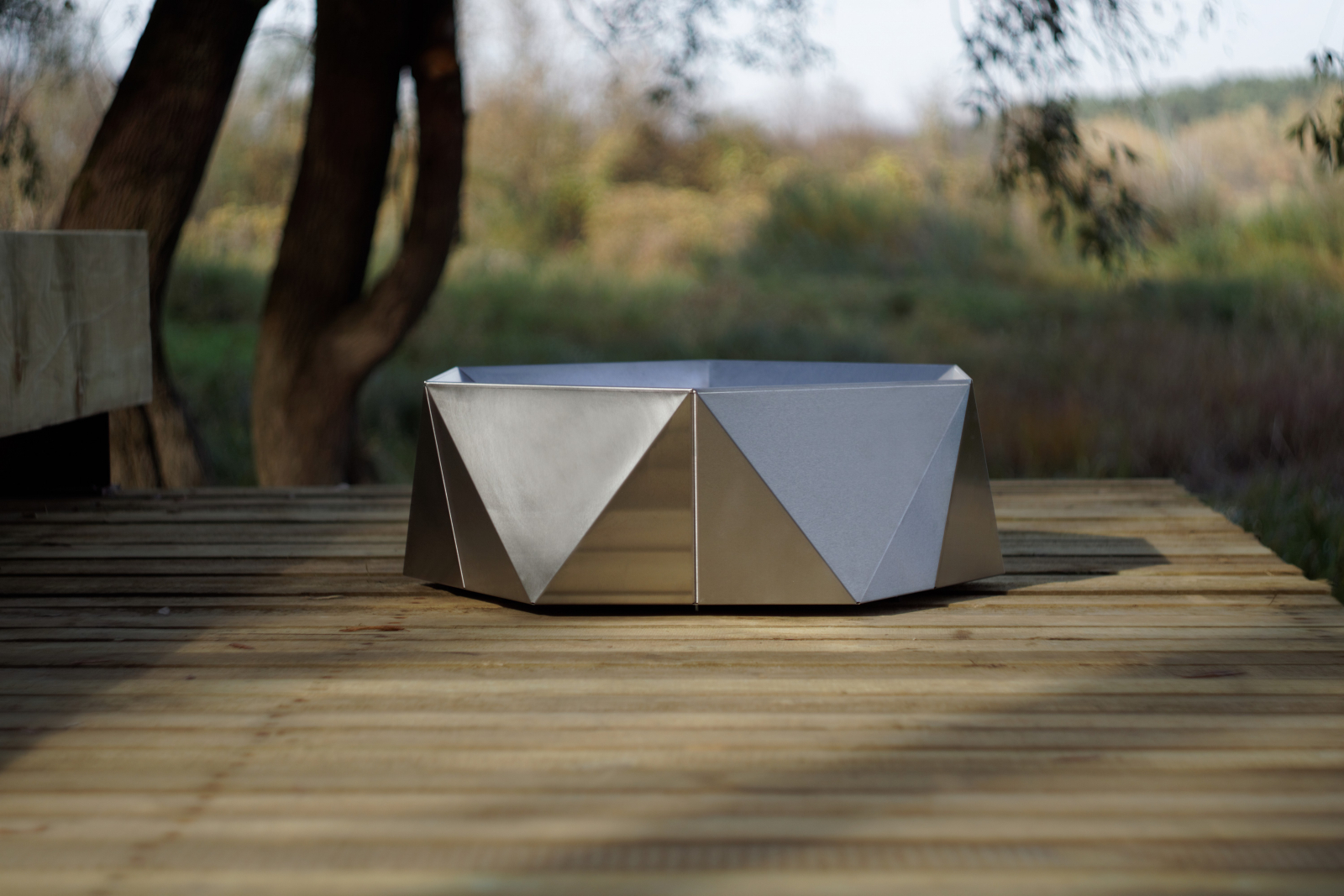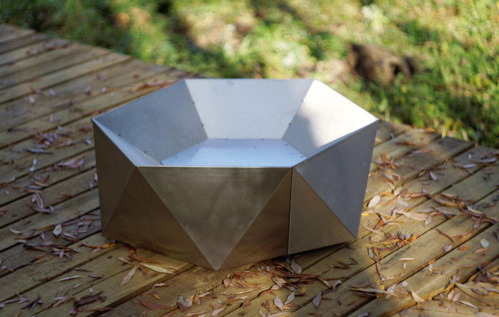 Exclusive 6-Eck-Feuerstelle JUNDA - aus massivem Edelstahl 2,0 mm Brennraum / 1,0 mm Außenverkleidung