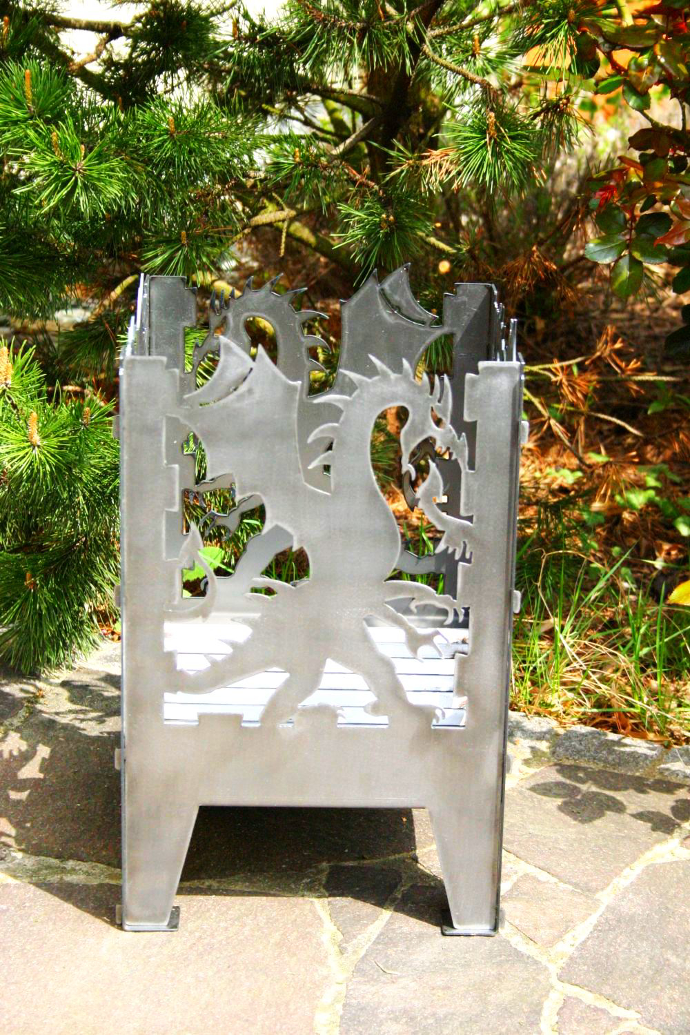 Feuerkorb Größe L Motiv Drache aus Rohstahl - Stecksystem - mit Ascheblech und massiven integriertem Gitterrost