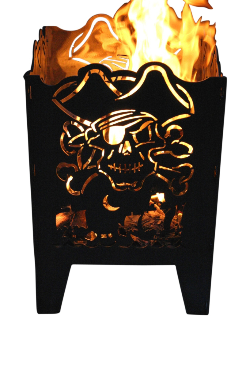 Feuerkorb Größe XXL Motiv Pirat mit attraktiven Lichtspiel-Effekten 2,0 mm Rohstahl (rostend) gefertigt - Stecksystem - Feuerkorb ist zerlegbar - Der massive Gitterrost sowie das integrierte Ascheblech gewährleisten Stabilität und Standsicherheit. Der große Bodenabstand schont den Untergrund.