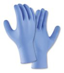 Nitril (blau), ungepudert, texturierte Oberfläche, AQL 1.5, Rollrand, links und rechts passend, geprüft für den Einsatz mit Lebensmitteln nach Verordnung (EG) 1935:2004, Materialstärke: Handfläche = ca. 0,12 mm/Finger = ca. 0,14 mm Spenderbox à 100 Stück