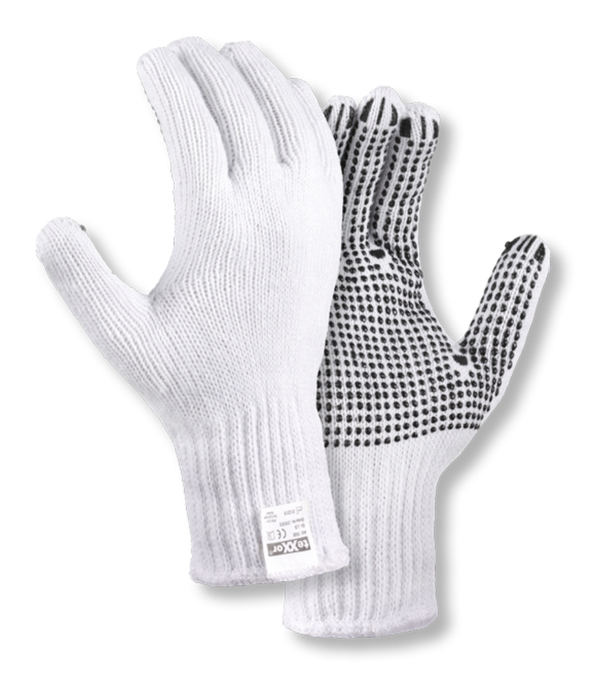 Baumwolle/Polyester-Strickgewebe, mit einseitig aufgebrachten schwarzen PVC-Noppen auf den Handinnenflächen, Strickbund, ca. 7 Gauge (= 3,664 mm)