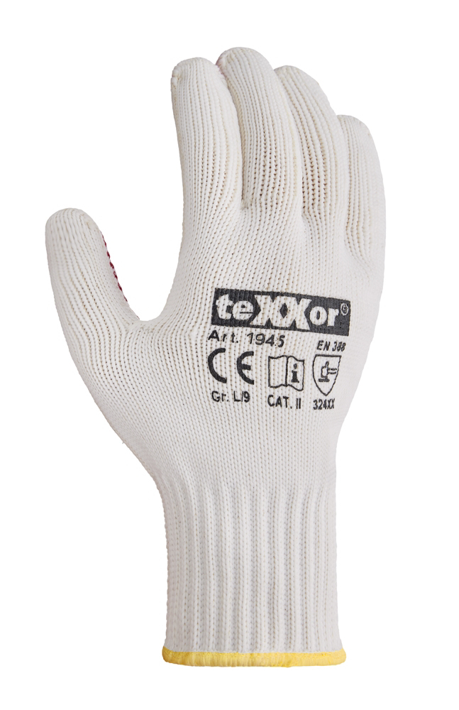Baumwolle/Nylon-Grobstrickgewebe, mit einseitig aufgebrachten roten PVC-Noppen auf den Handinnenflächen, Strickbund, ca. 7 Gauge (= 3,664 mm)