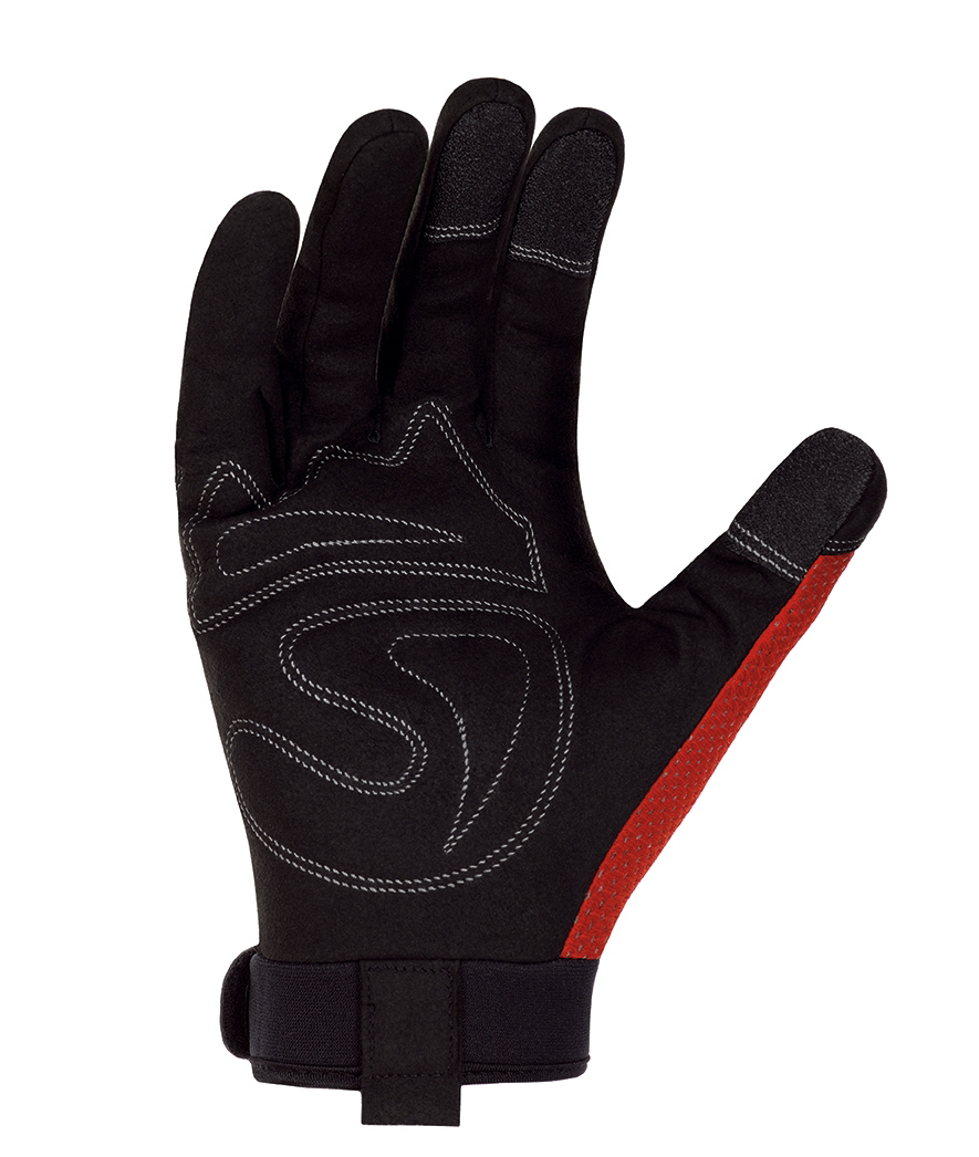 Nylon/Terylene/Polyester/Elasthan-Super-Airmesh-Gewebe, rot, mit abgepolstertem Belastungsbereich in der Innenhand aus Kunstleder, schwarz, Protektoren auf dem Handrücken, aufwendige Verarbeitung, Klettverschluss am Handgelenk, paarweise auf Pappreiter