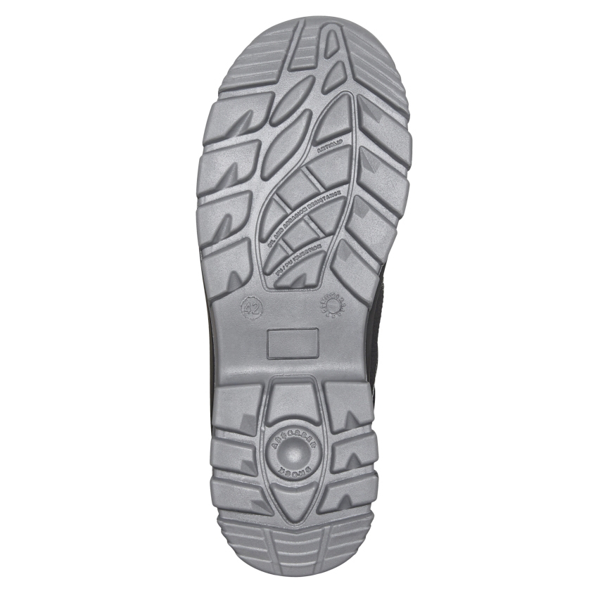 Obermaterial: genarbtes Rindleder Futter: atmungsaktives Textil-Funktionsfutter Sohle: 2-Dichten PU/PU-Sohle mit PU-Überkappe Zehenschutzkappe: metallfreie Composite-Kappe Durchtritthemmung: metallfrei Fußbett: ganzflächige Einlegesohle Plus: metallfrei