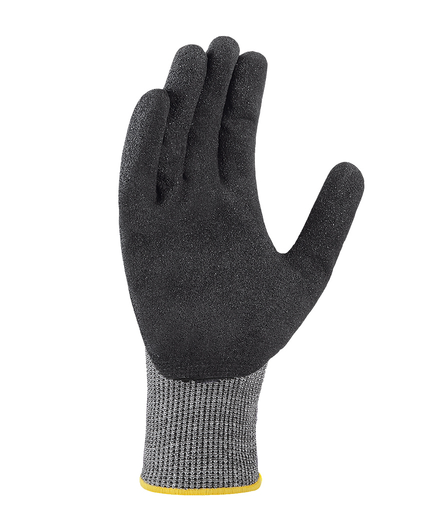 HDPE/Polyester/Nylon/Glasfaser/Elasthan-Mischgewebe, Nitril-Handflächenbeschichtung (schwarz), besandet (Sandy finish), nahtlos, hohe Schnittfestigkeit (ehemals nach EN 388:2003 Klasse 5), Strickbund, Handflächenstärke: ca. 1,8 mm, ca. 13 Gauge (= 1,828 mm)