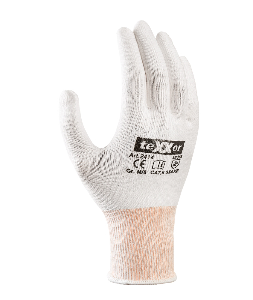Polyethylen/Nylon/Spandex-Mischgewebe, ohne Beschichtung, Strickbund, ca. 13 Gauge (= 1,828 mm), Materialstärke Handfläche: ca. 1,1 mm