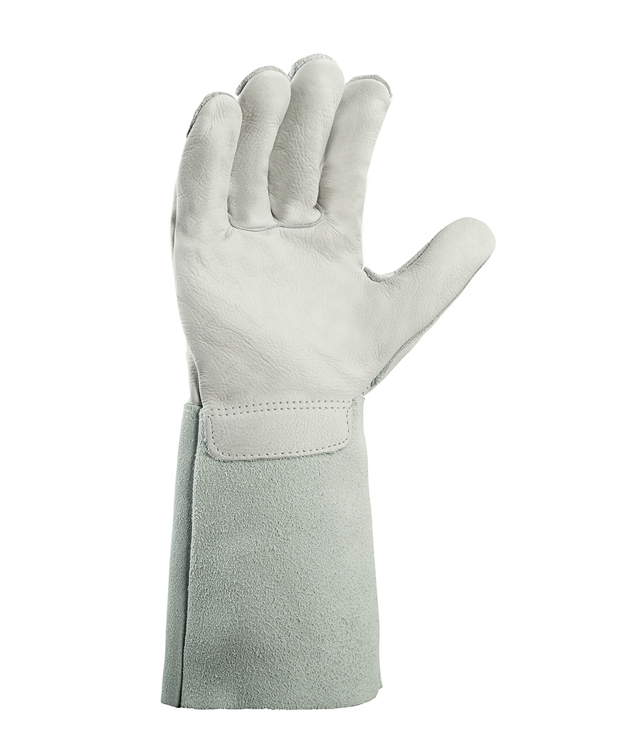 Rindvoll-/Spaltleder, 5-Finger-Design, ungefüttert, Pulsschutz durch extra lange Stulpe (15 cm), Handschuhlänge: ca. 35 cm; Lederstärke: 1,0-1,2 mm