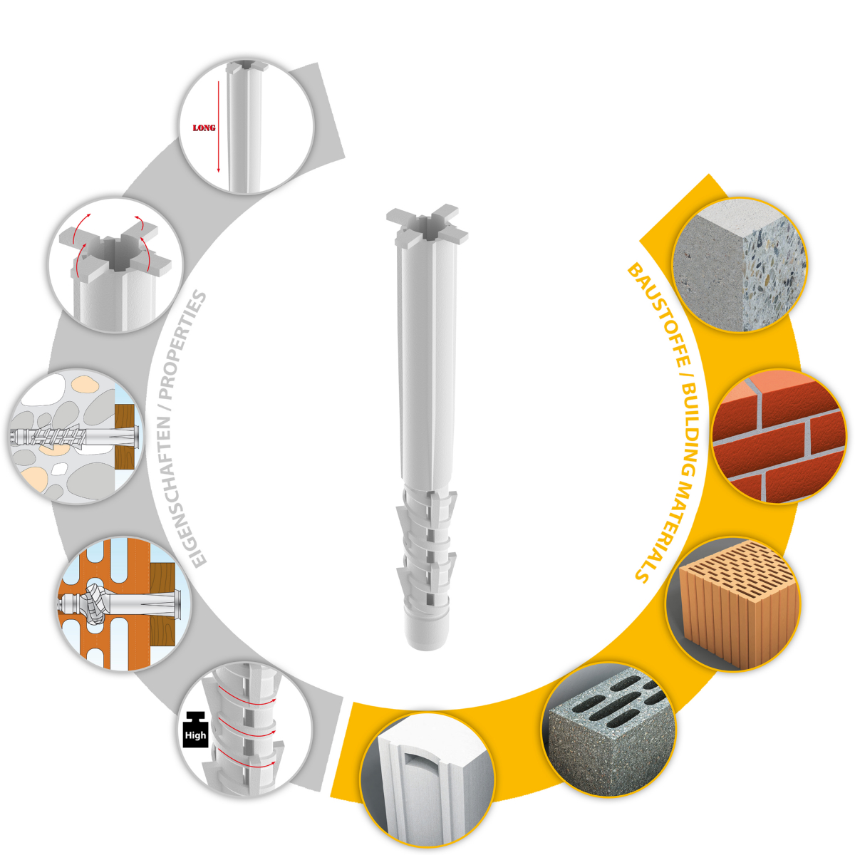 - Drehsicherungen am Dübelhals verhindern das Mitdrehen im Baustoff