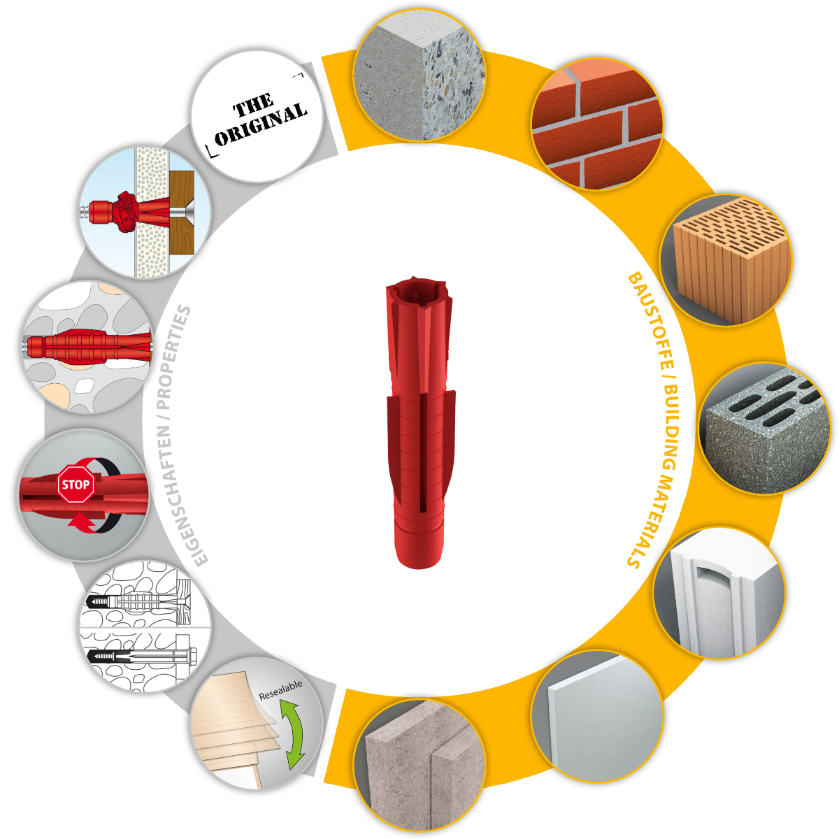 Der rote TRI ist das Original aller Allzweckdübel und eine ausgezeichnete Wahl für DIY-Projekte und professionelle Anwendungen. Er bietet hohe Haltewerte, Stabilität und ist sehr einfach zu installieren, was Zeit spart. Der Dübel ist ein echtes Multitalent, da er in nahezu allen Baustoffen hält und somit eine breite Anwendungspalette abdeckt. Durch seinen 3-fach geteilten Dübelkörper und besonderen Kunststoff verknotet oder spreizt der Allzweckdübel TRI zuverlässig je nach Erfordernis. So eignet er sich für die unterschiedlichsten Befestigungsprojekte in Gipskarton, Porenbeton, Beton, Vollstein, Kalksandstein und weiteren Materialien. Dieser Dübel kann für die Vor- und Durchsteckmontage verwendet werden und die Drehsicherungen am Dübelhals und Dübelkörper verhindern außerdem ein unerwünschtes Mitdrehen im Bohrloch.