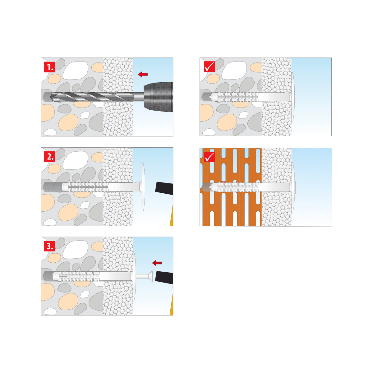 - Für unverputzte Dämmstoffplatten genügen vier Dübel pro m²