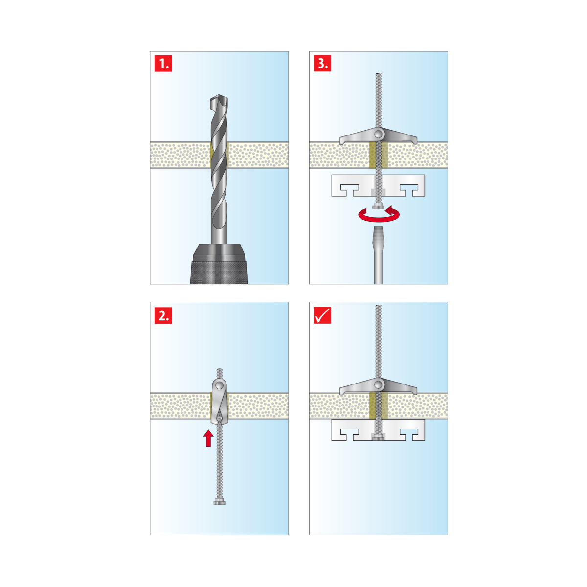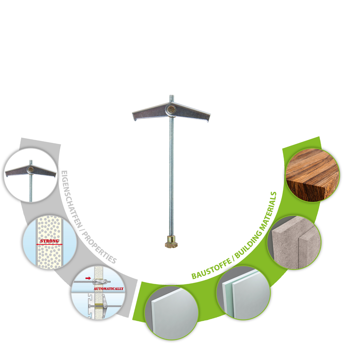 - Galvanisch verzinkter Hohlraumklappdübel aus Metall mit zwei Klappflügeln, Unterlegscheibe aus Metall und Rändelmutter